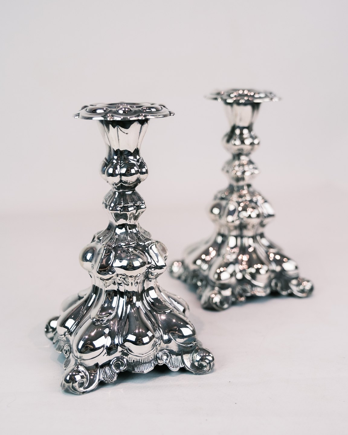 Sæt af 2 rococo-formede lysestager i ægte 830 sterling sølv fra 1920'erne. Disse stager kombinerer tidens dekorative stil med solidt sølvhåndværk, typisk for 1920'erne.