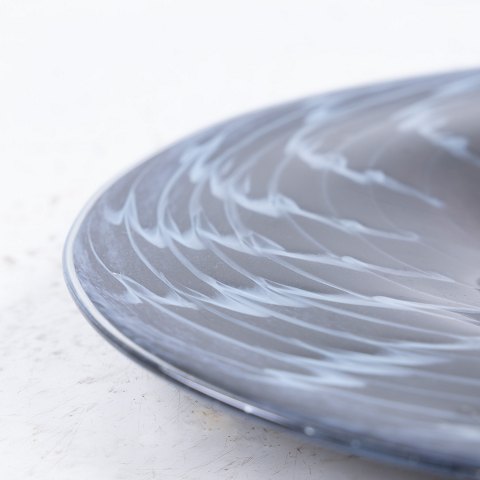 Fladt glasfad m. blåt mønster.
