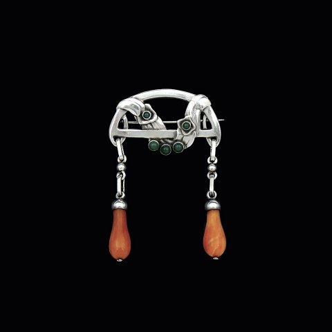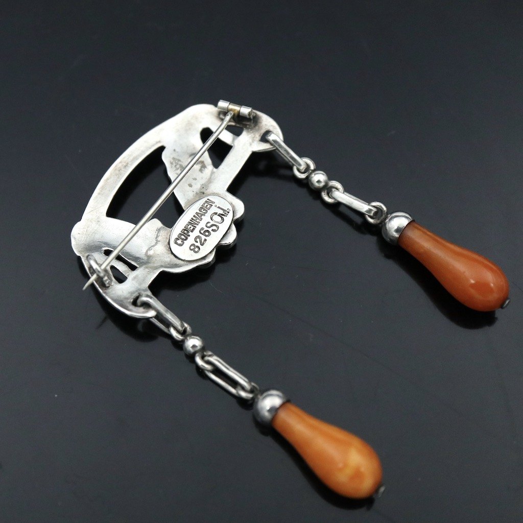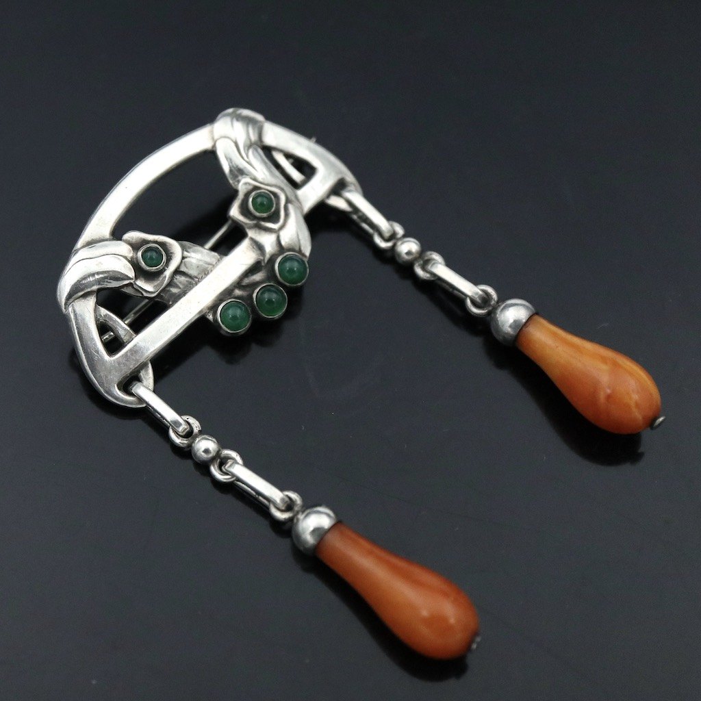 Georg Jensen. Broche i 826s sølv med agat og rav. 1907-14 stempler.