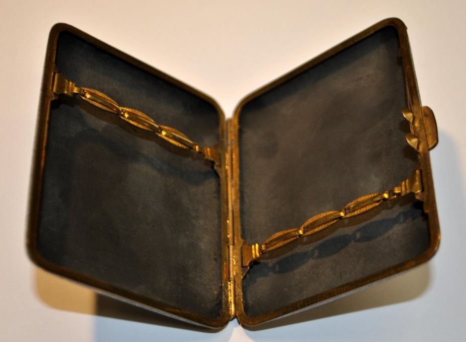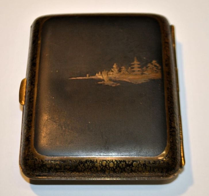 Japansk cigaret etui, 20. årh. Sølv/messing. Dekoreret med Fuji bjerget og vandmølle. 8 x 6,5 cm.