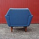 Et sæt lænestole med ben i lakeret teaktræ. Stolene er betrukket med blåt uldstof.