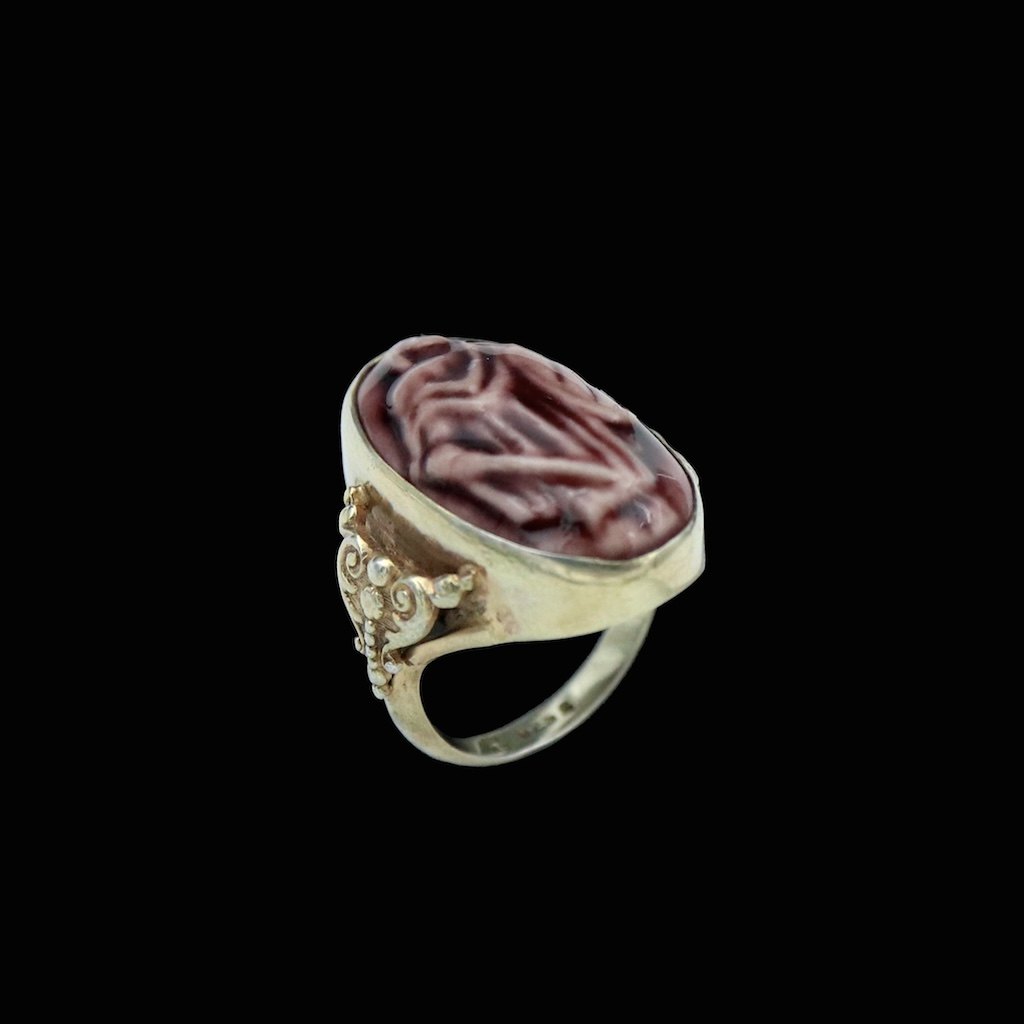 Jais Nielsen 1885-1961. Ring i forgyldt sterling sølv med keramisk relief.