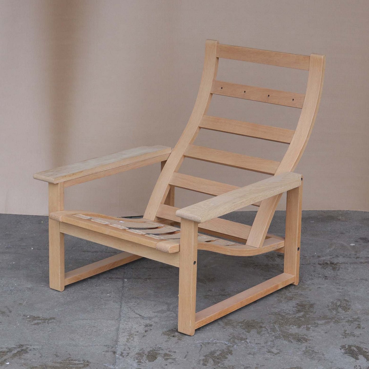 Lænestol med stel i egetræ i flot stand og hynder betrukket med ternet stof med brugsspor