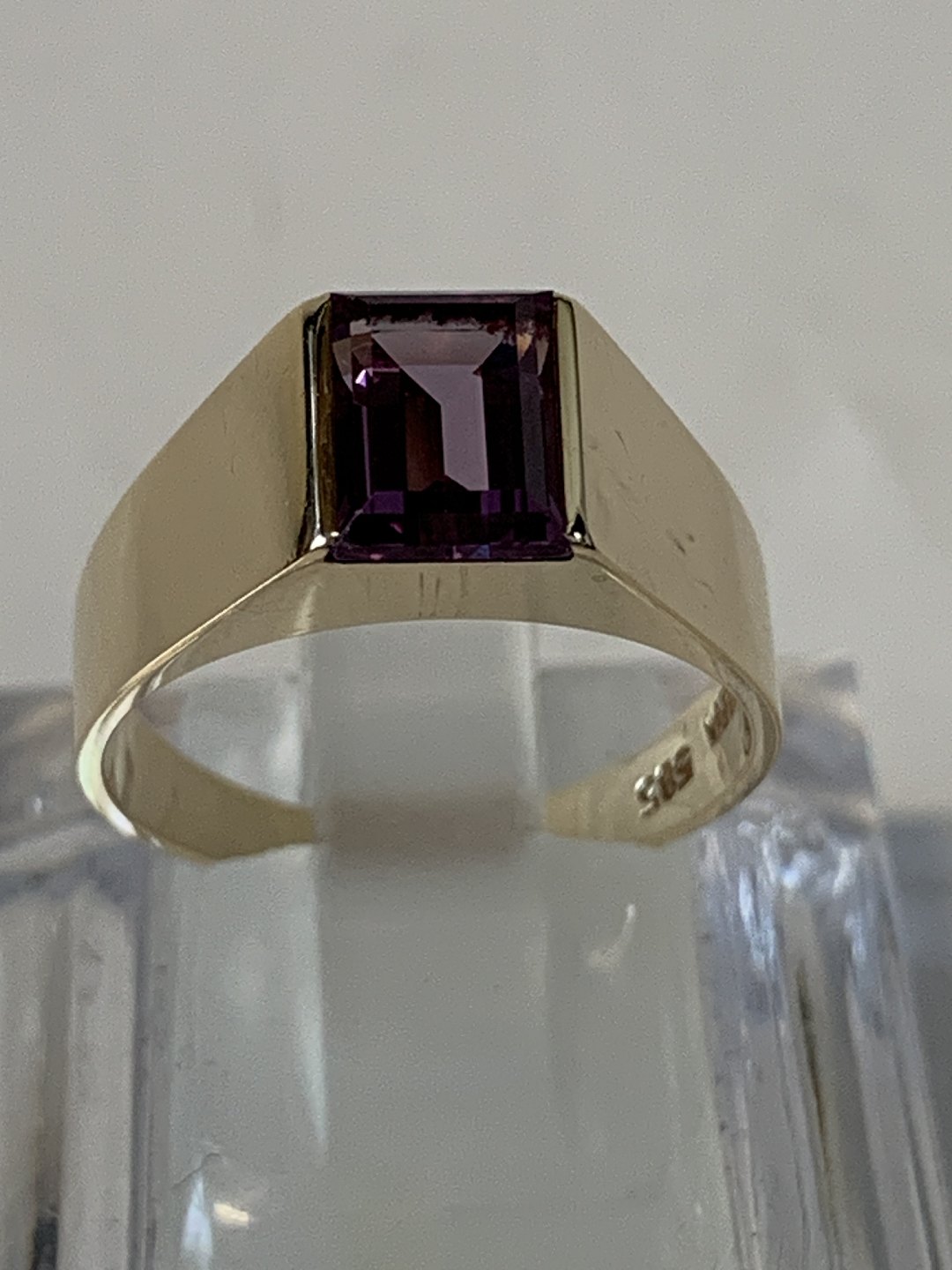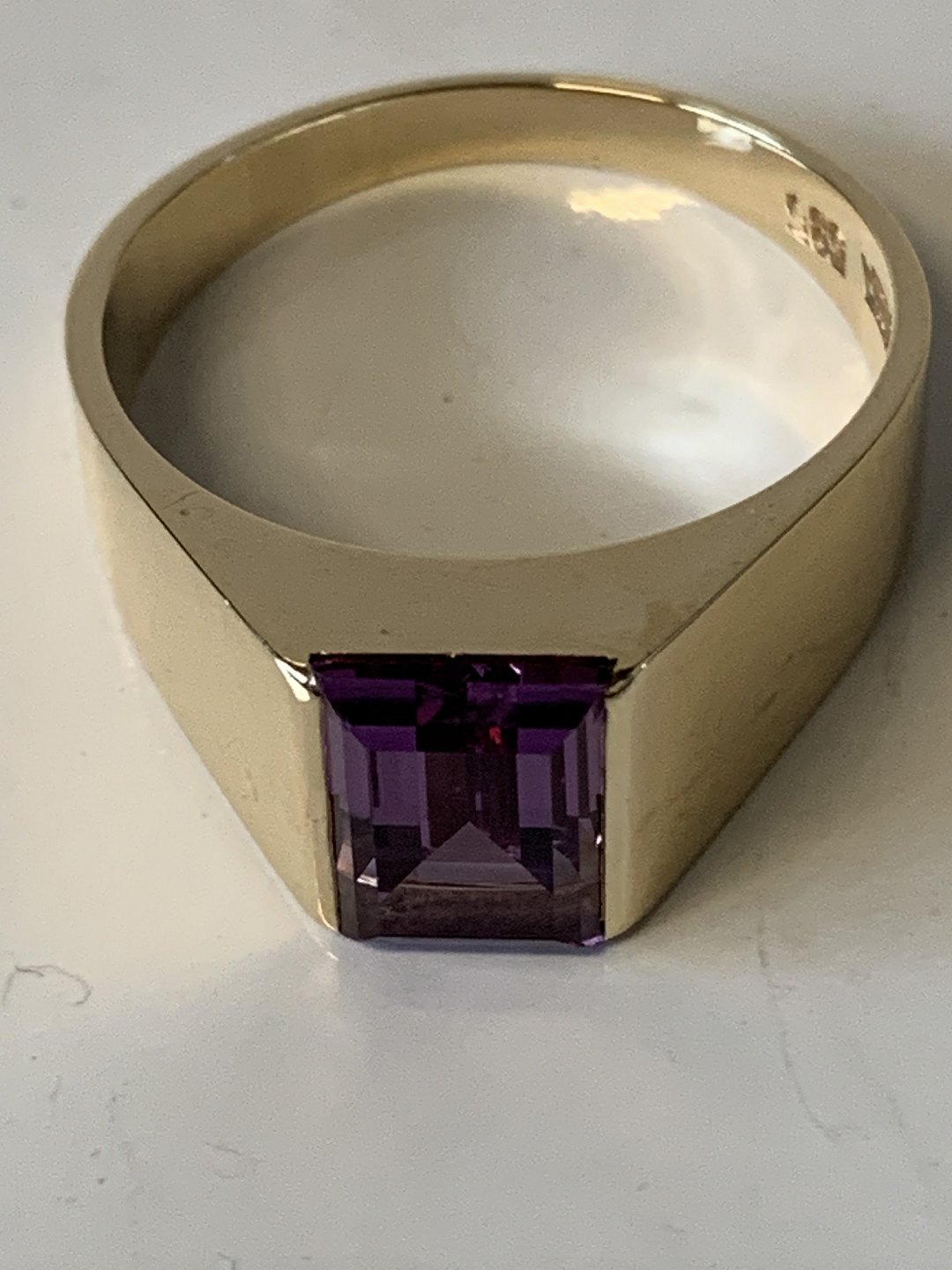 Guldring i tidløst design, med amatyst i 14 karat guld. Stemplet Gifa 585. Størrelse 55.