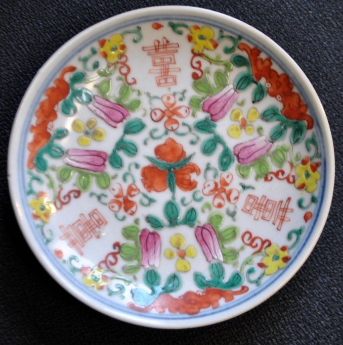 Kinesisk porcelains tallerken, polykron dekoreret, 19. årh. Motiv med blomster og skrifttegn. Signeret. Dia: 12 cm.