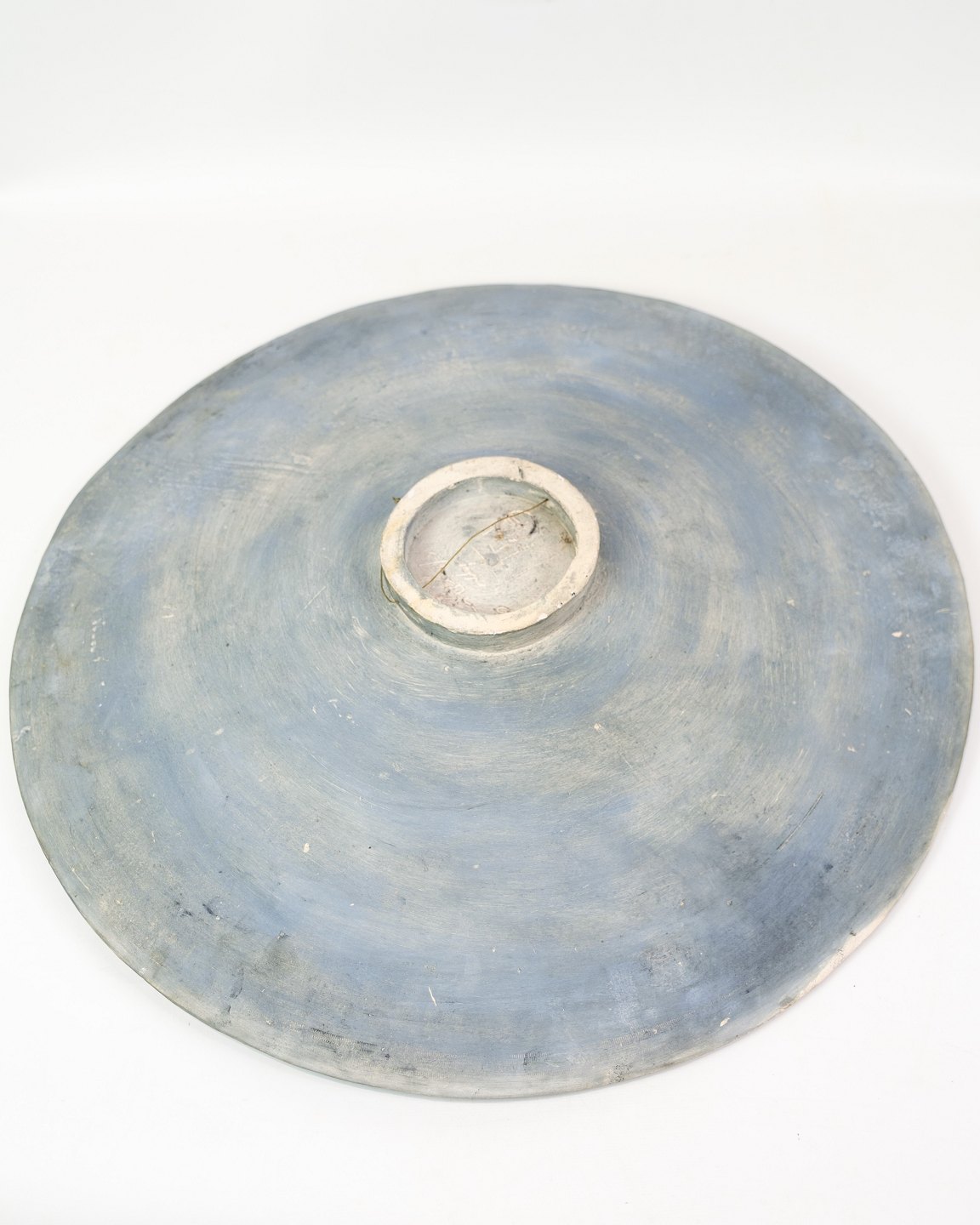 Unique ceramic dish by Jeppe Hagedorn-Olsen (1929–2011), who was a renowned Danish ceramist and painter, educated at the Royal Danish Academy of Fine Arts in Copenhagen and the ceramics school in Faenza, Italy. He was known for his innovative ceramic works, which ranged from tall, cylindrical sculptures to rustic dishes with organic shapes. His use of colors such as ochre, blue and black as well as non-figurative reliefs and friezes distinguish his style. Hagedorn-Olsen received several international awards and exhibited widely, both in Denmark and globally. His works balance precise forms and artistic rhythm, which has secured him a place as a significant figure within modern ceramics.