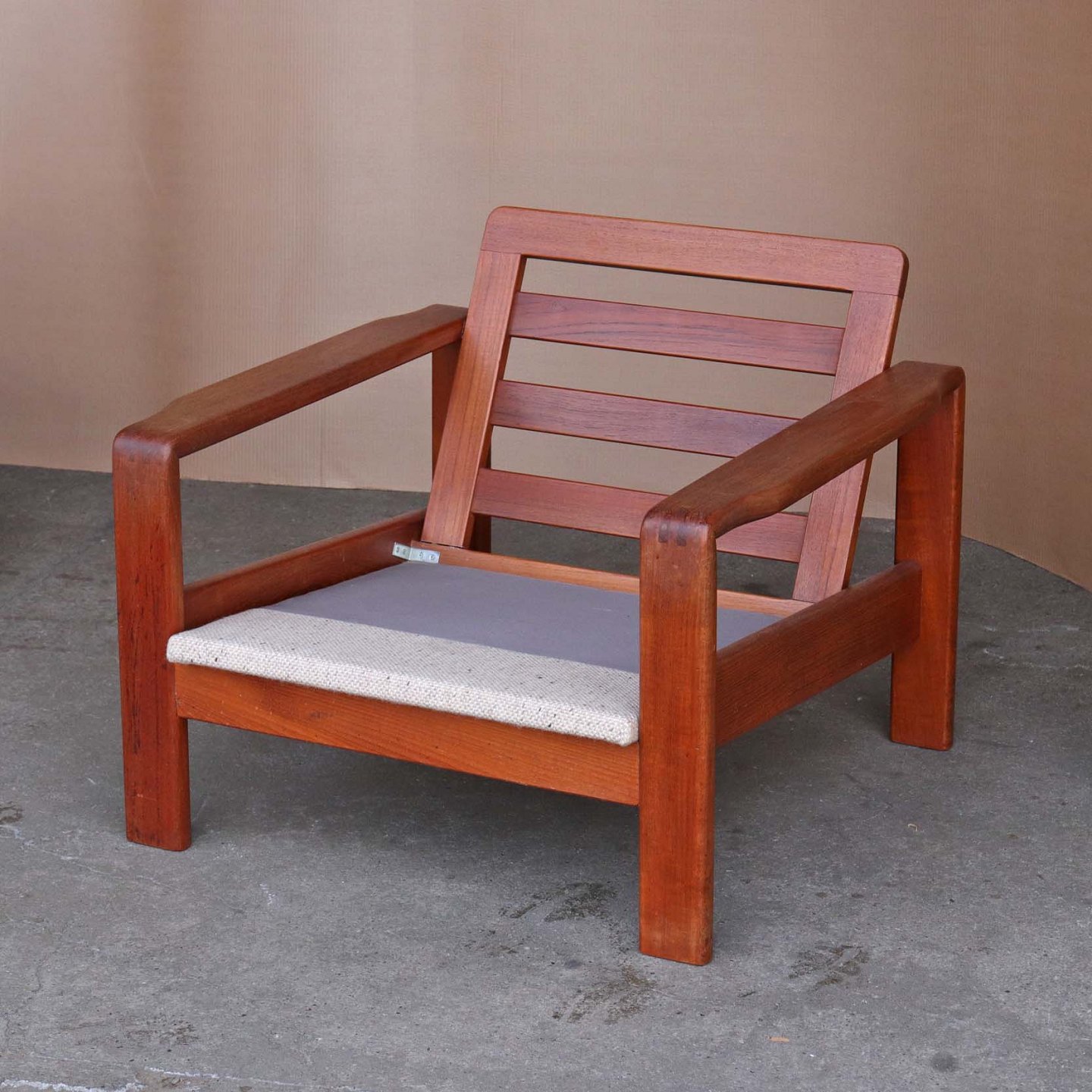 Et sæt lænestole med stel i lakeret teaktræ og hynder betrukket med lyst uldstof.