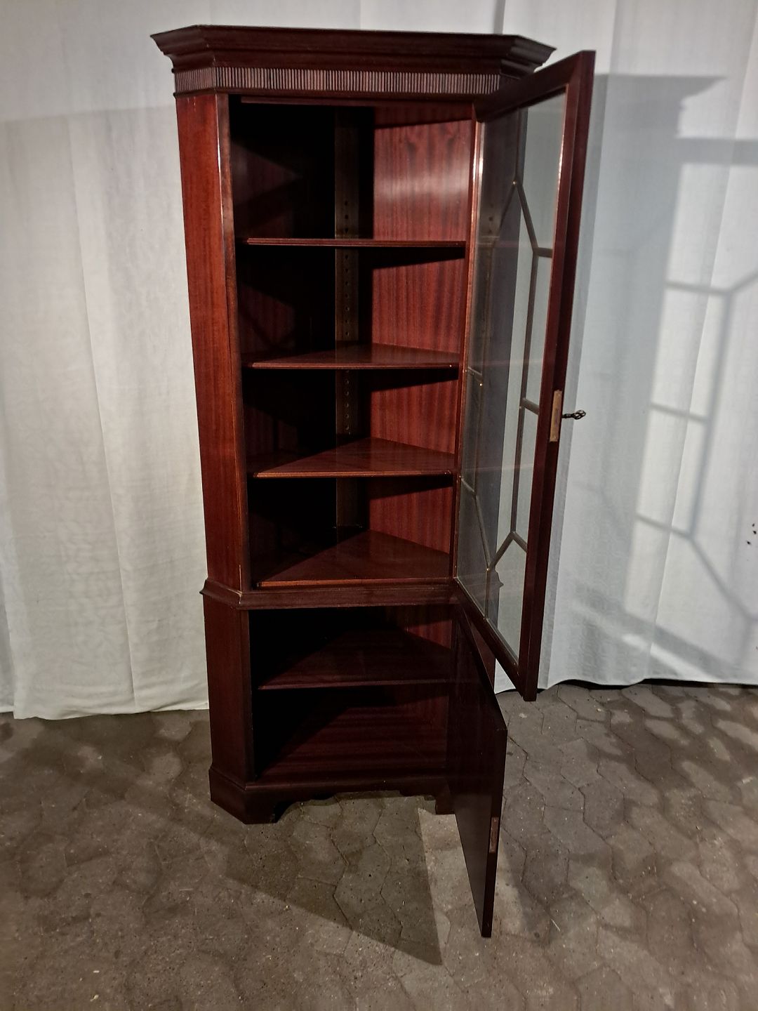 Hjørneskab i fineret mahogni, fra 1980erne.