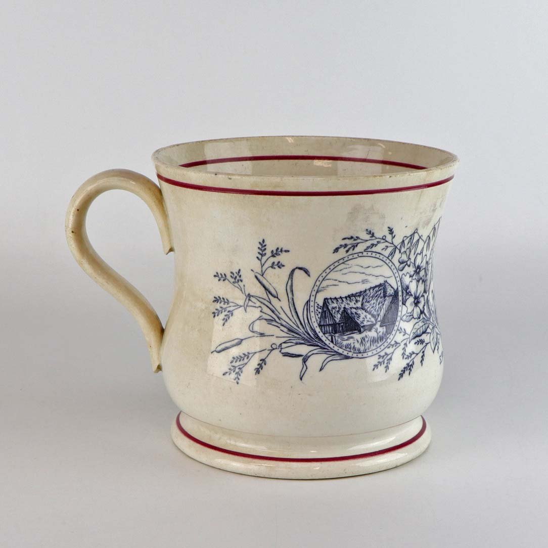 Antik ølkrus i fajance, som også er kendt under navnet Portlands krus. Dette krus er fremstillet i perioden år 1870-1923 og er dekoreret med kobbertryk i blå og rød farve med motiv af ko, bondehus og høstvogn omgivet af blomsterranker.