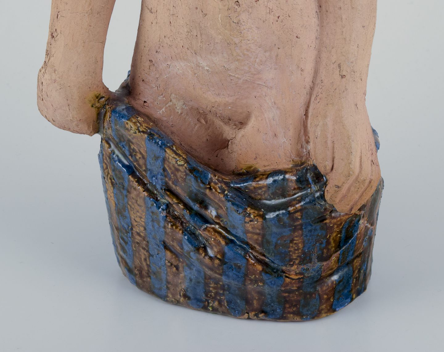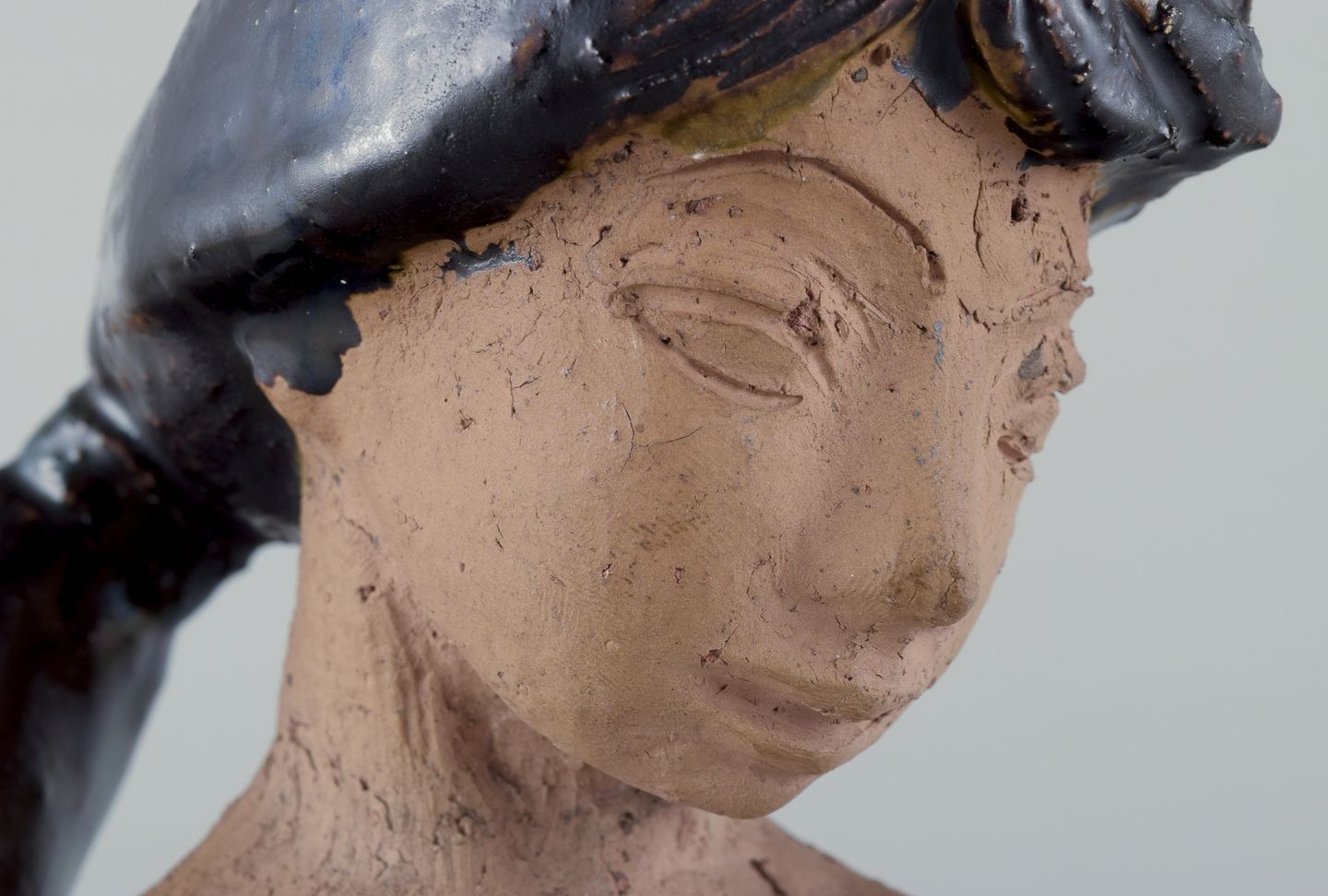 Unikafigur af delvis glaseret lertøj modelleret i form af nøgen kvinde med klæde.