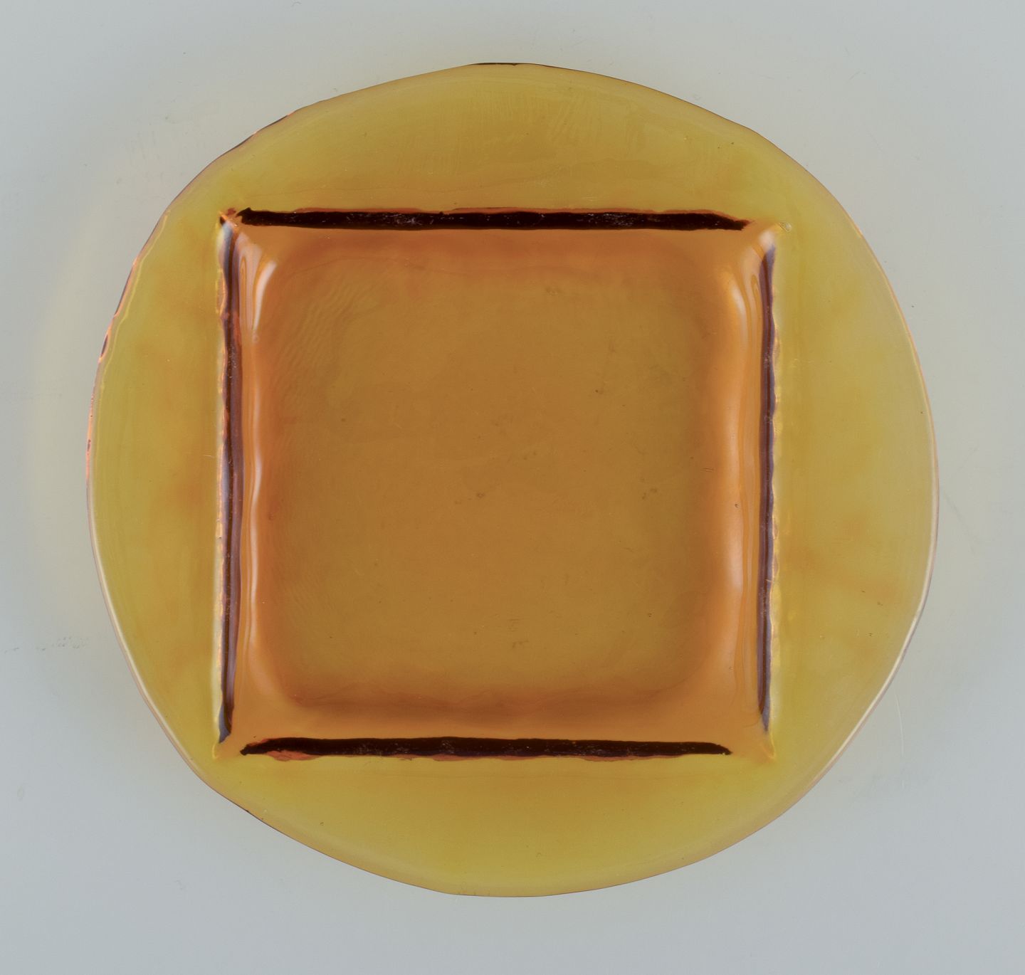 Skandinavisk glasdesigner. Et sæt på fire tallerkener i røgfarvet kunstglas. Kvadratisk fordybning i tallerkenen.