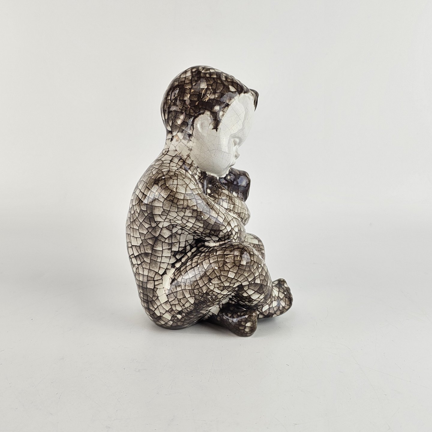 Figur med krakeleret udseende, med motiv af en lille dreng med en hundehvalp.