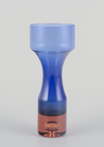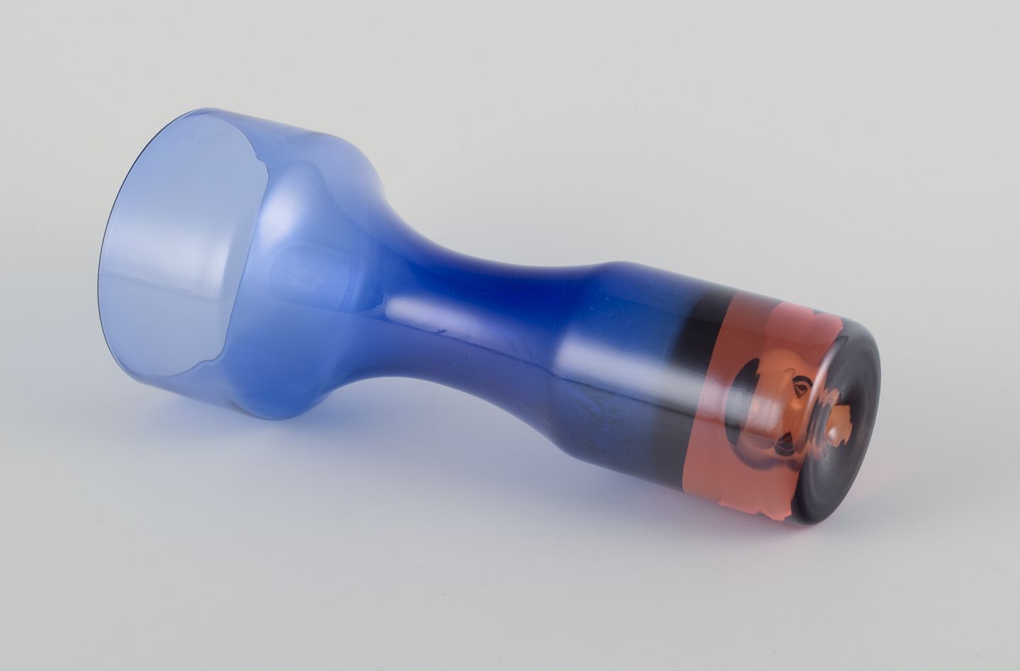 Kunstglas i blå og orange. Stor glasboble i bunden.