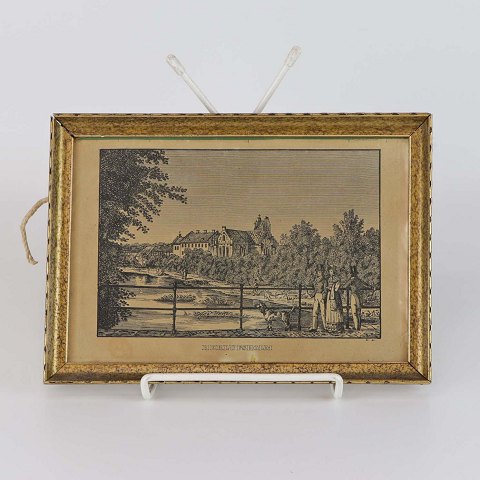Indrammet kobberstik i struktureret træramme med motiv af Herlufsholms kirke og klosterbygning set fra hvælvingebroen.