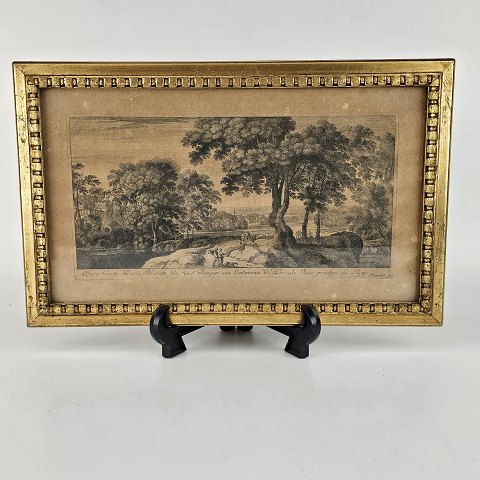 Bogtryk med motiv af landskab med flod, træer og mennesker med hund.