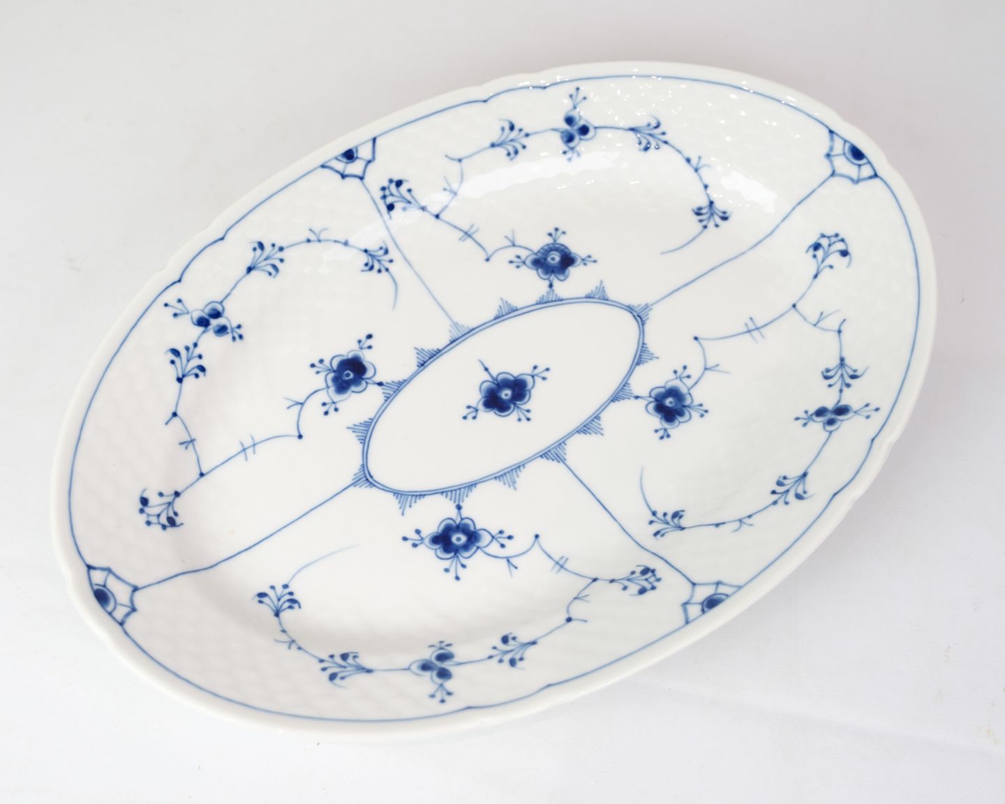 Ovalt Fad nr. 16 fra Bing & Grøndahl. Fremstillet af porcelæn med klassisk musselmalet design i håndmalet blå dekoration.