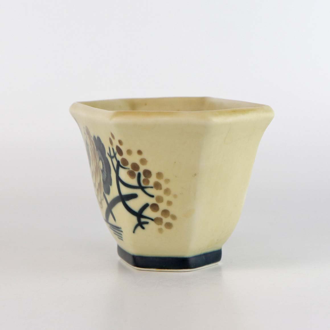 Kongelig sekskantet vase i mat porcelæn med motiv af blomster med blå streg på cremefarvet baggrund. Nr. 28/6