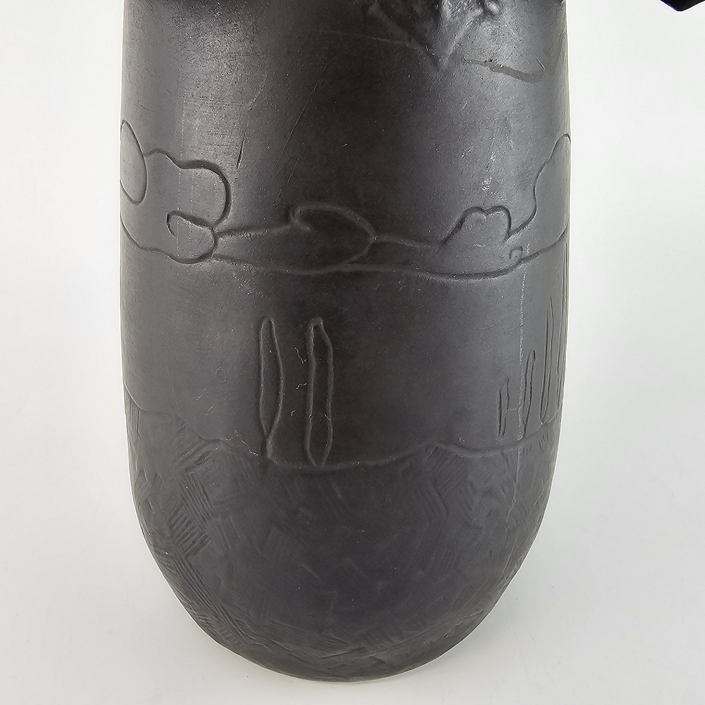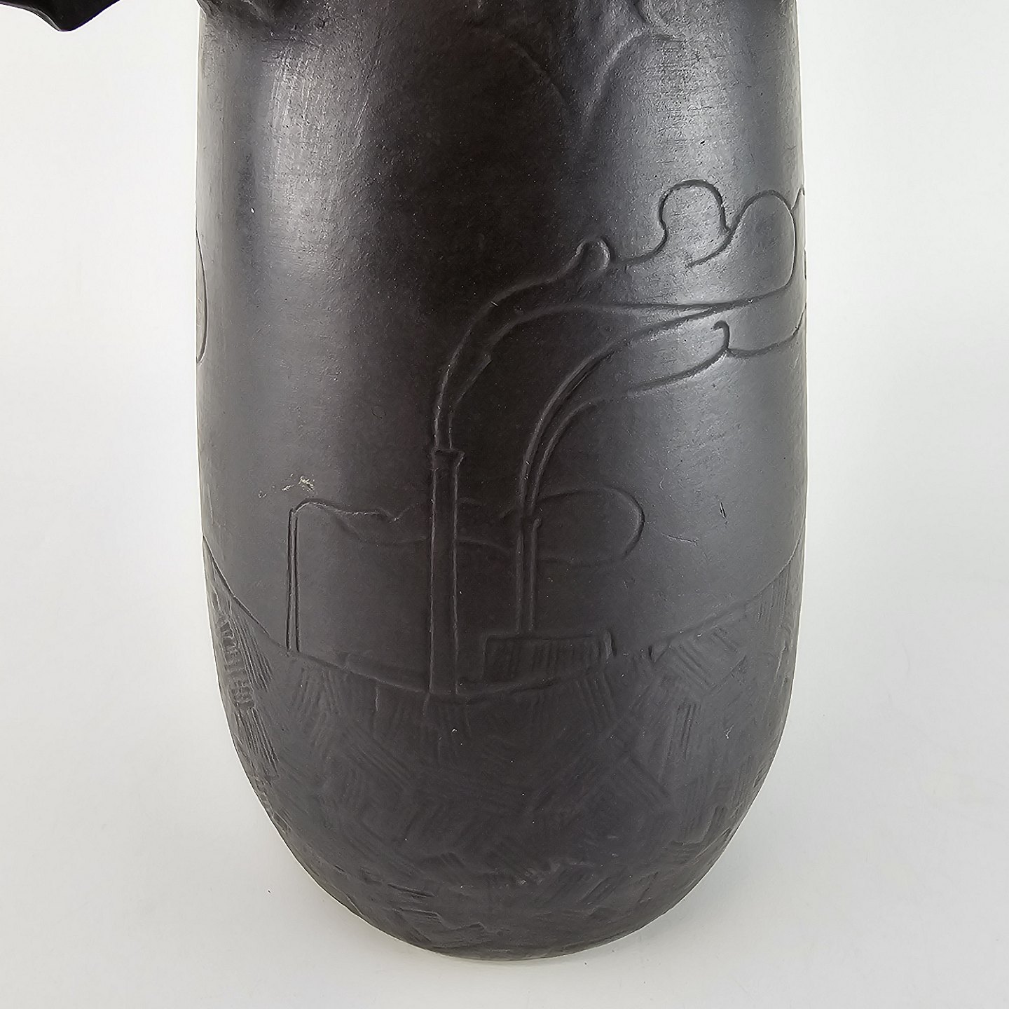 Høj sort vase, af terracotta, med dekoration af tre flagermus, vinge ved vinge. Nr 787