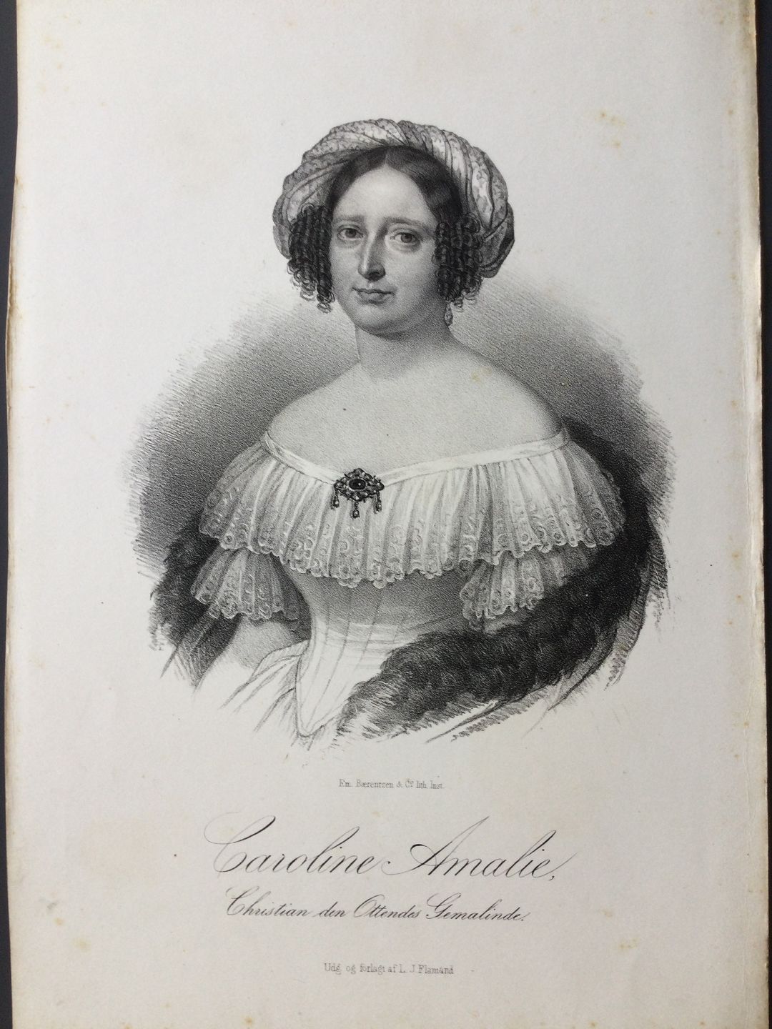 Litografi af Em. Bærentzen - Portræt af HM Dronning Caroline Amalie til Norge og Danmark.