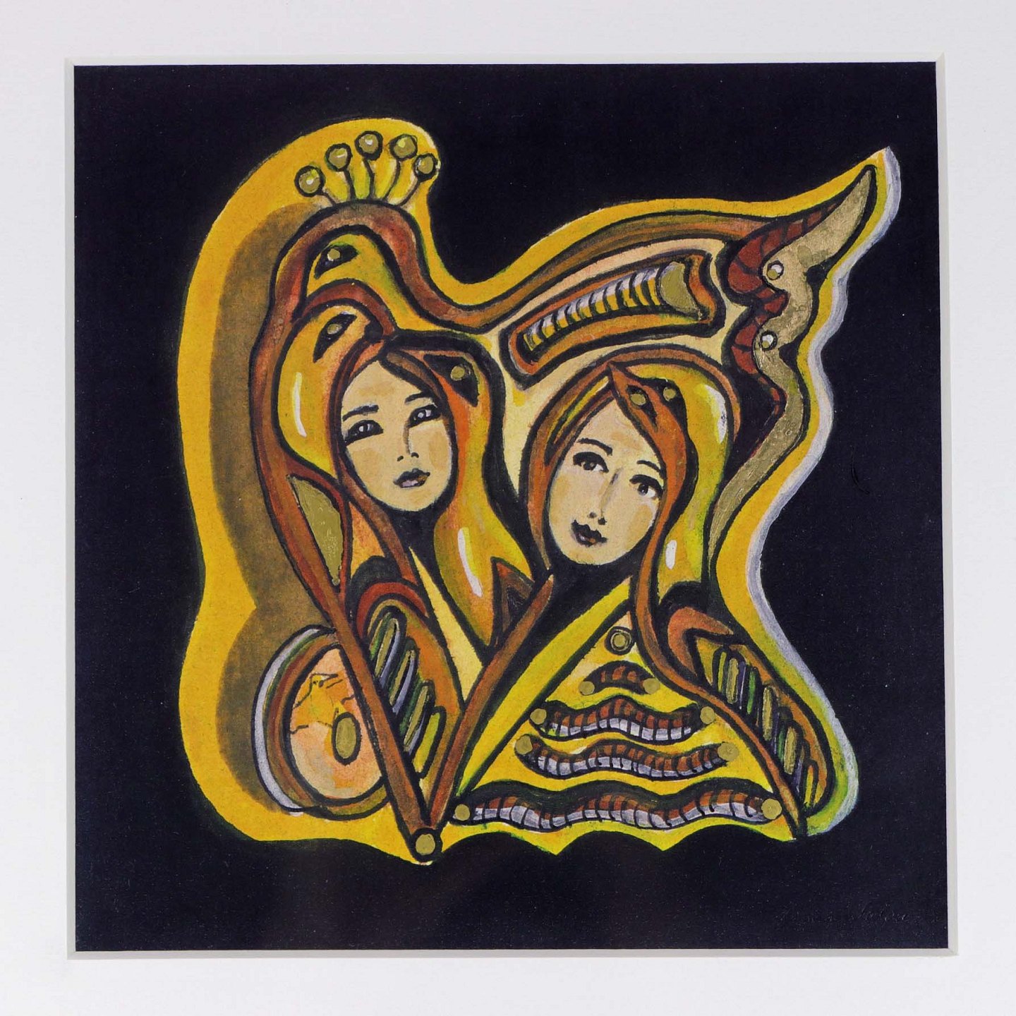 Indrammet maleri med hvidt passepartout i gylden aluminiums ramme med motiv af to fugle og to kvinder. Maleriet er navngivet Ud af mørke I