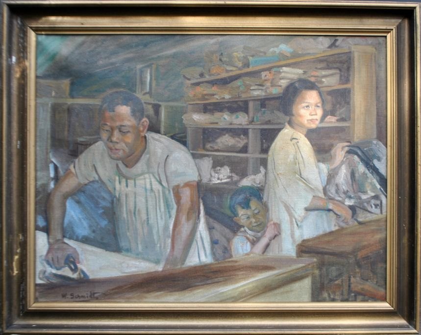 Schmidt, W. (20. årh.): Kinesisk renseri. Olie på lærred. Signeret. H: 56 cm. B: 74 cm.