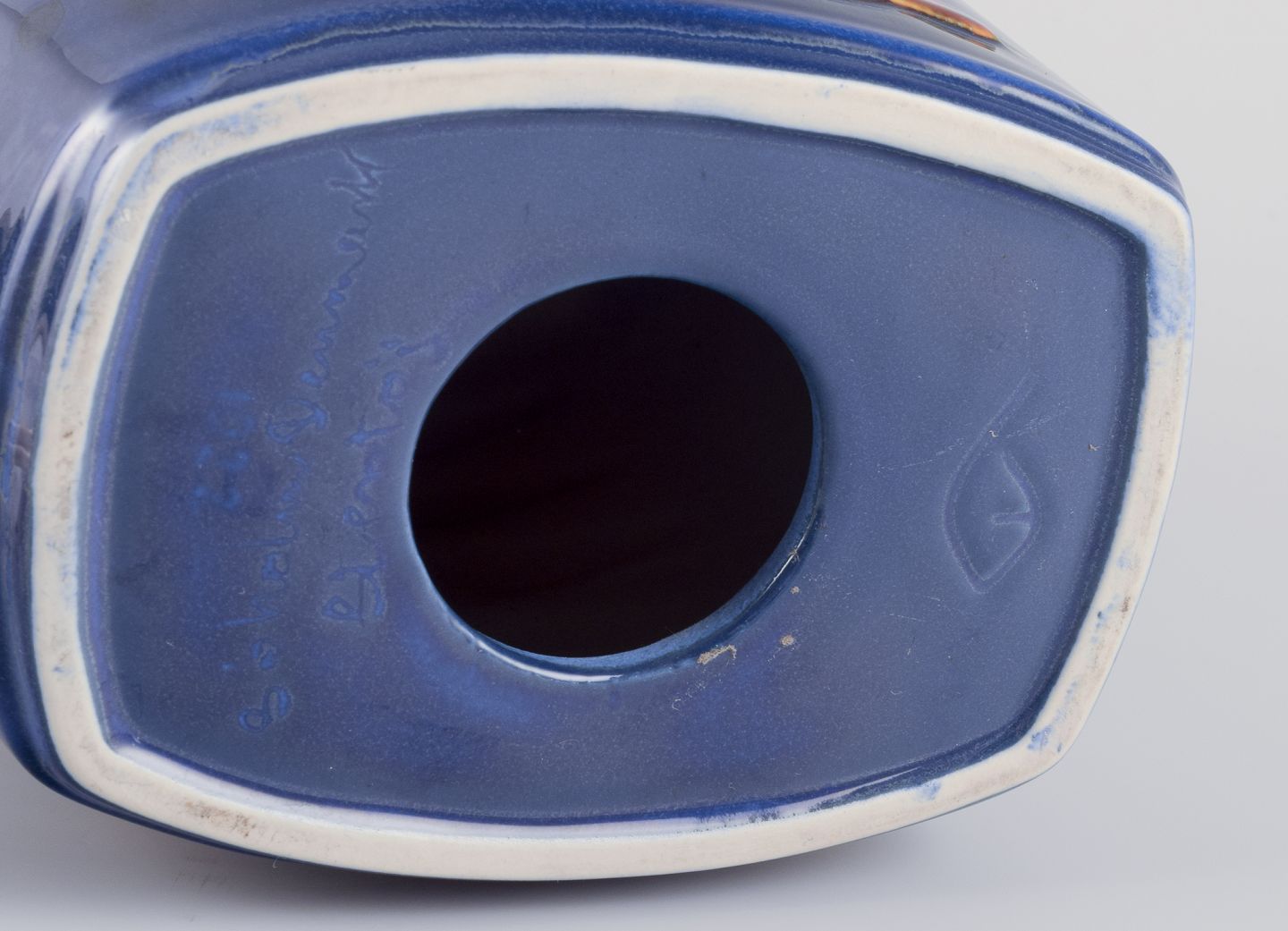 Okkergul glasur på blå bund.