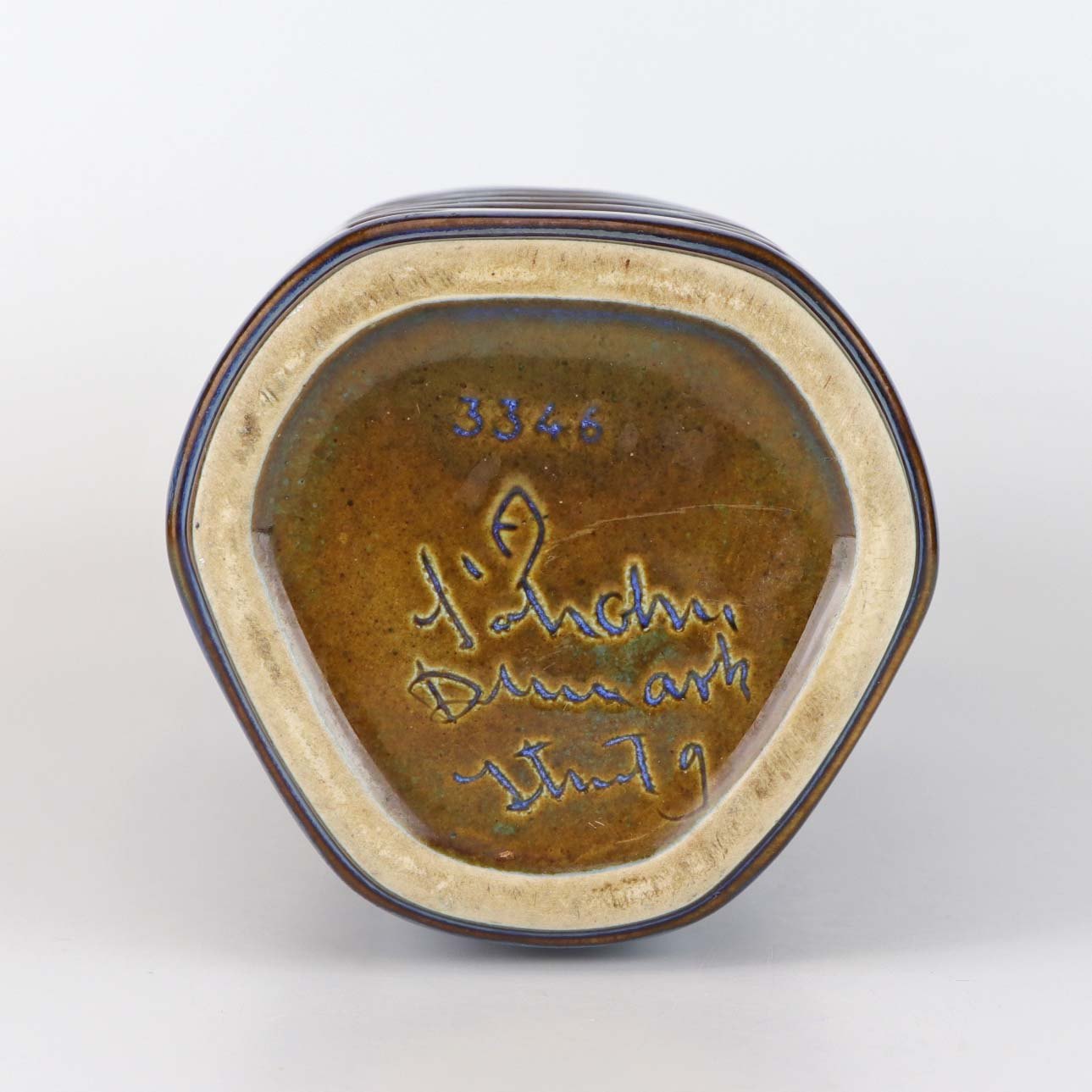 Kantet vase i stentøj fra serien EJ 64 med blå glasur og udstående mønster. Nr. 3346