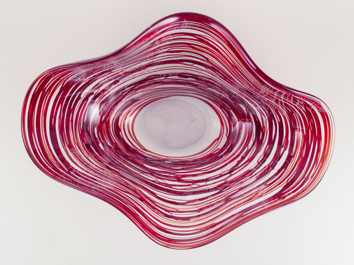 Kolossal unika bordskål af glas, prydet med horisontale røde glasdekorationer i relief. Håndlavet.