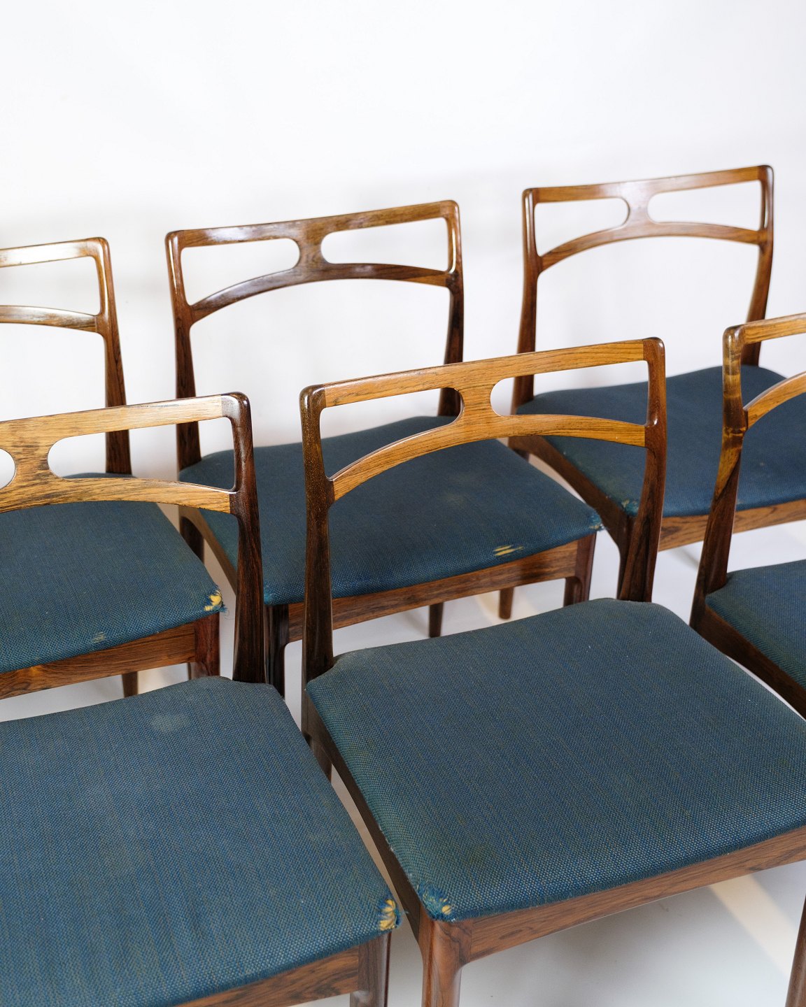 Sæt af seks spisestuestole, model 94, designet af Johannes Andersen og produceret af Christian Linneberg Møbelfabrik i 1960’erne. Stolene er udført i palisander med sæder i blåt stof.