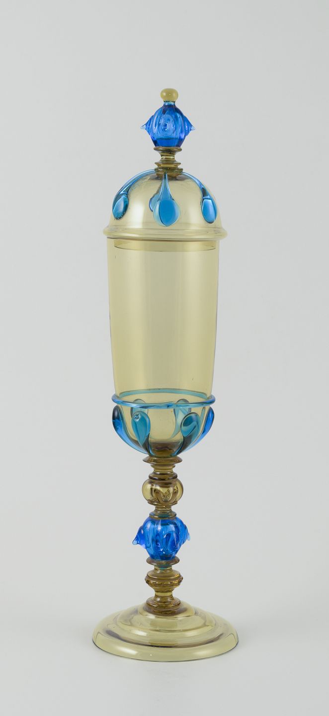 Murano, Italien. Stor pokal lågvase af blåt og røgfarvet kunstglas.