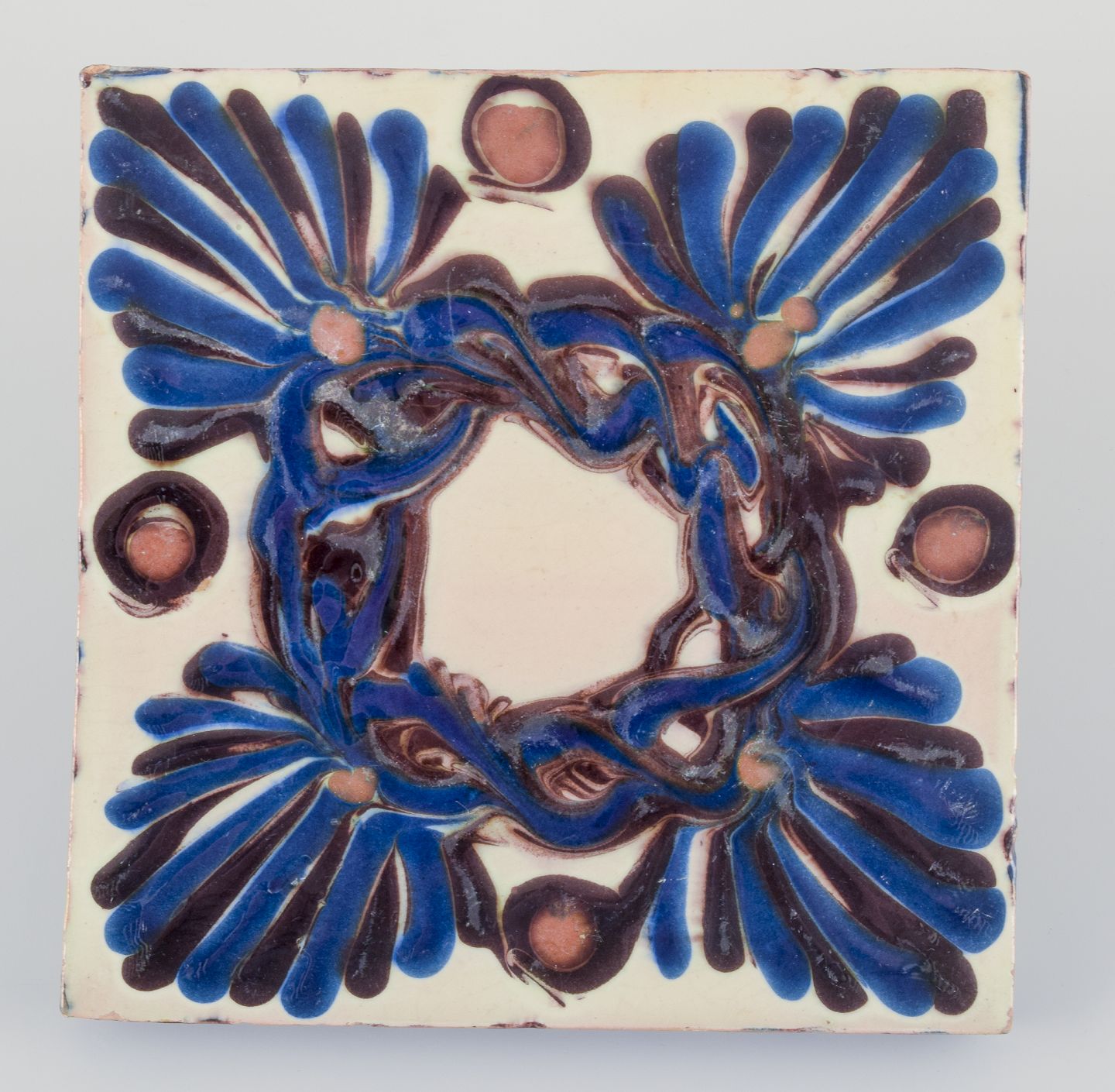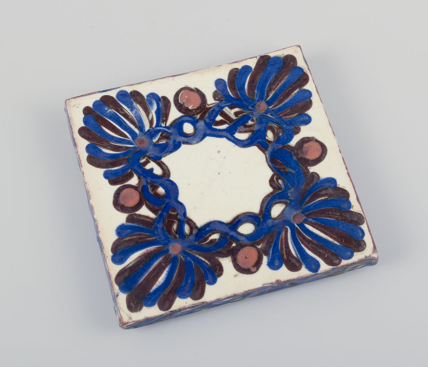 Hånddekoreret i blåt og brunt på cremefarvet bund.