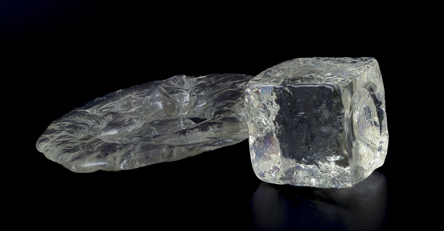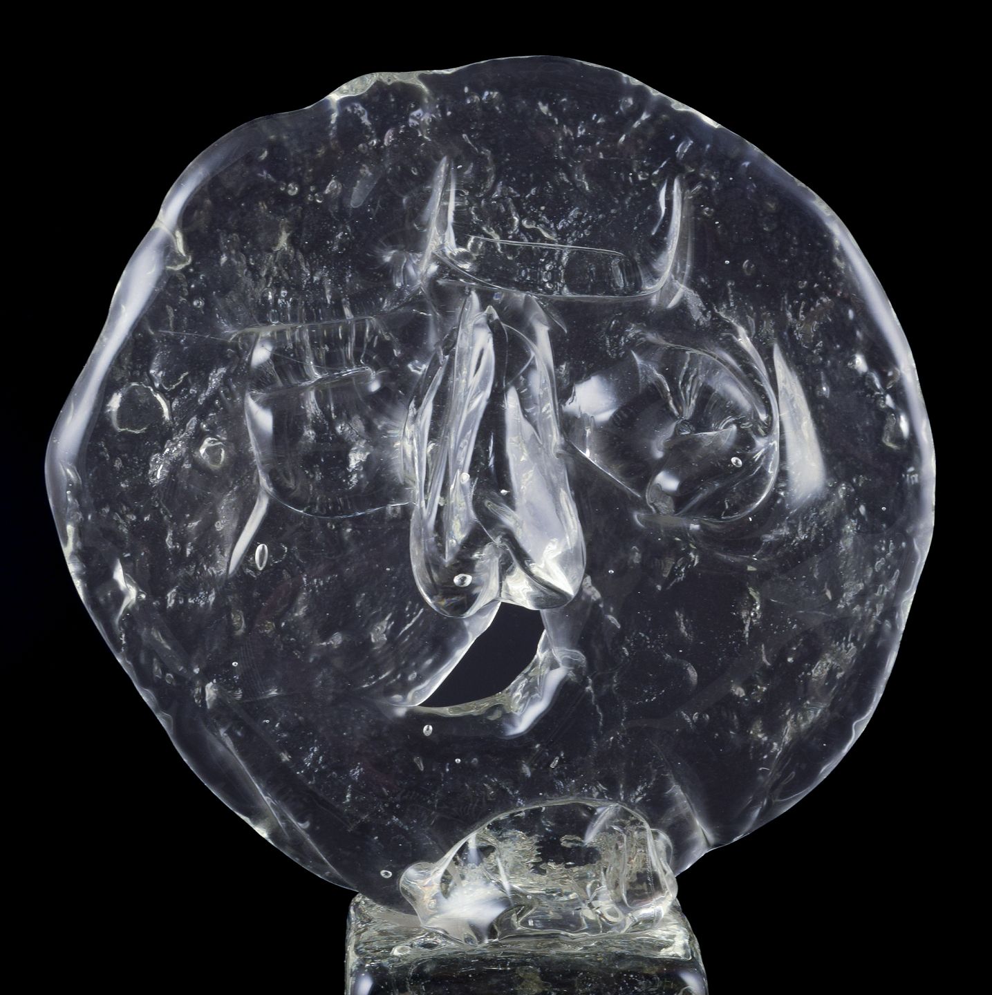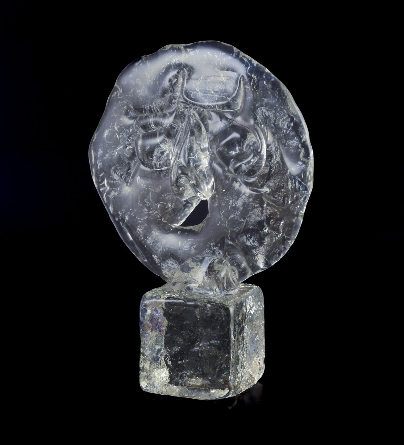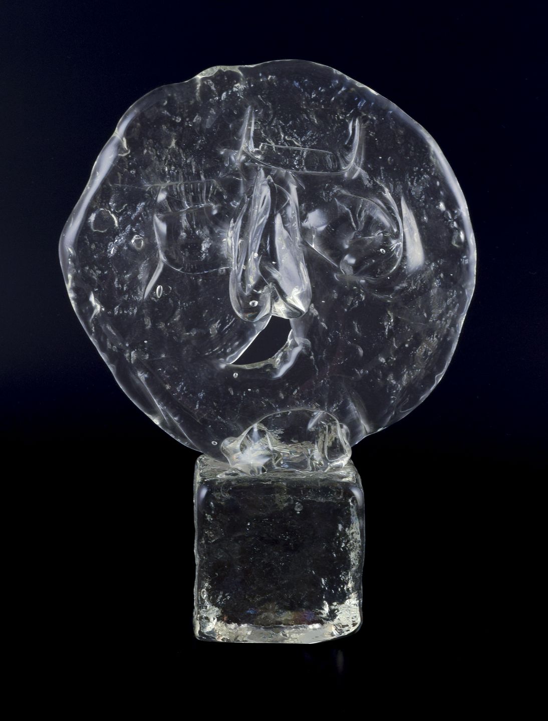 Stor skulptur af mandeansigt i klart kunstglas på sokkel.