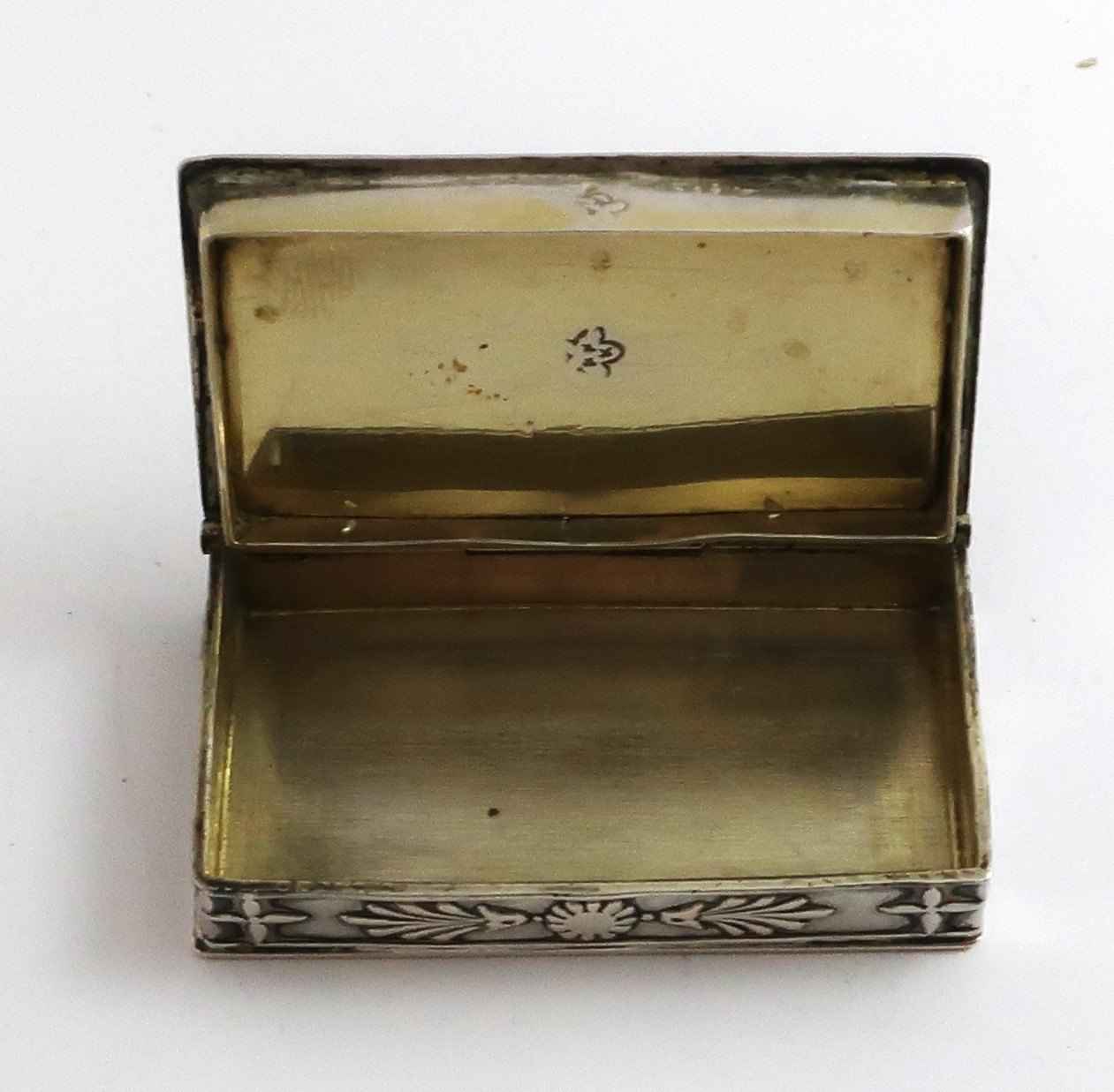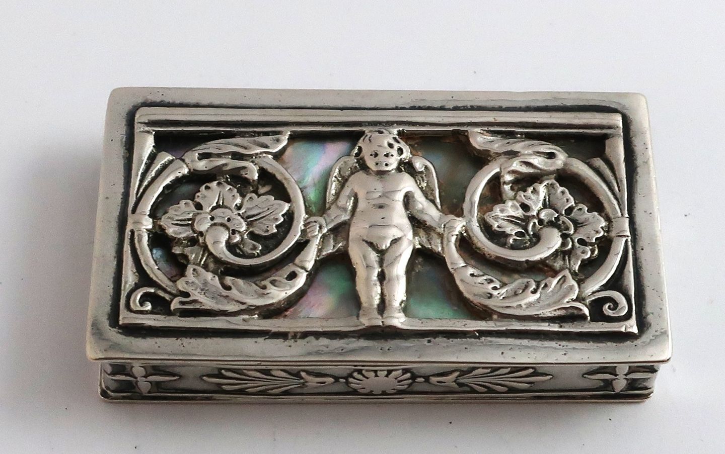 Lille sølvæske (830). Med perlemor i bunden af låg. Længde 5,3 cm. Bredde 3 cm.