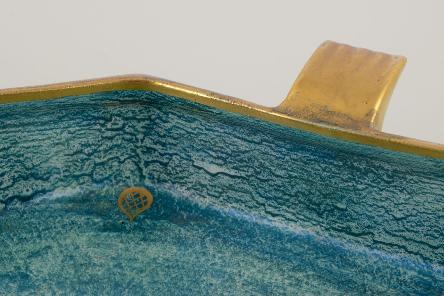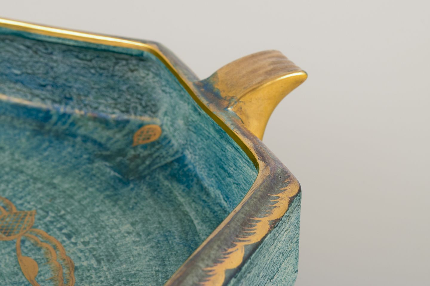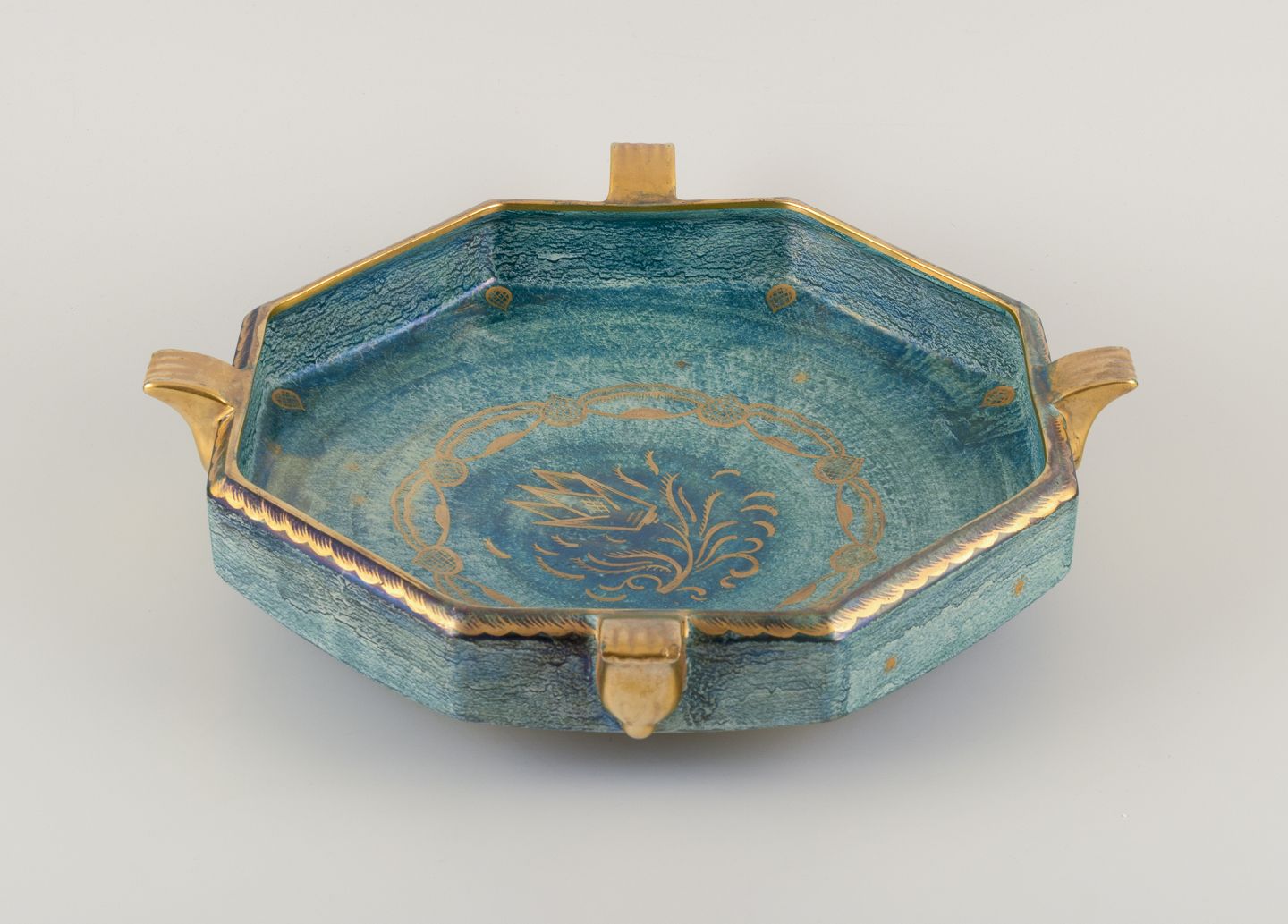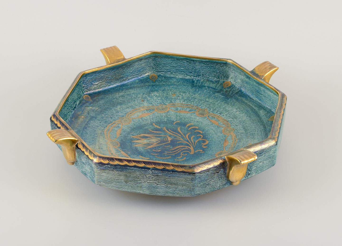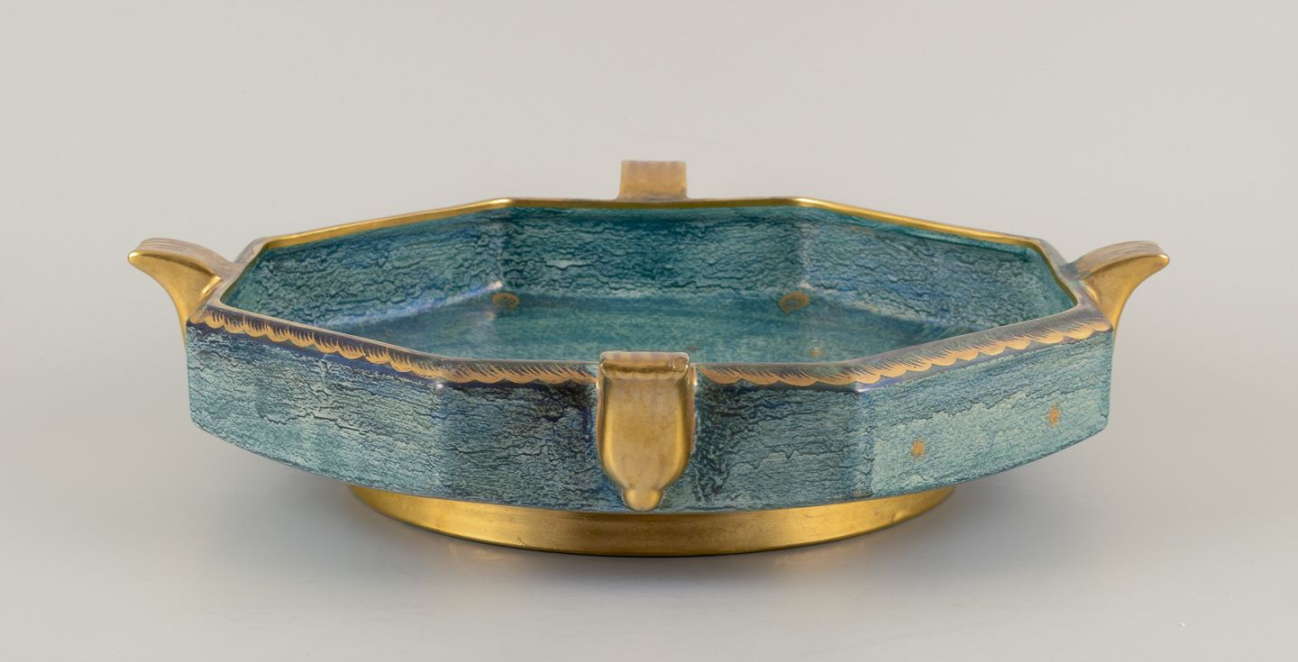 Stor ottekantet skål af keramik. Håndmalet i grønne toner med gulddekoration.