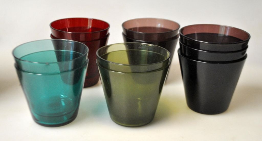 Franck, Kaj (1911 - 1989 ) Finland: Party glas og karaffel, ca. 1954. Produceret af Nuutajärvi Notsjö. Karaffel i klart glas med 11 drikkeglas i forskellige farver. Inkl. original beholder. Karaffel højde: 23 cm. Dia: 8 cm. Glas højde: 6 cm. Dia: 7 cm.