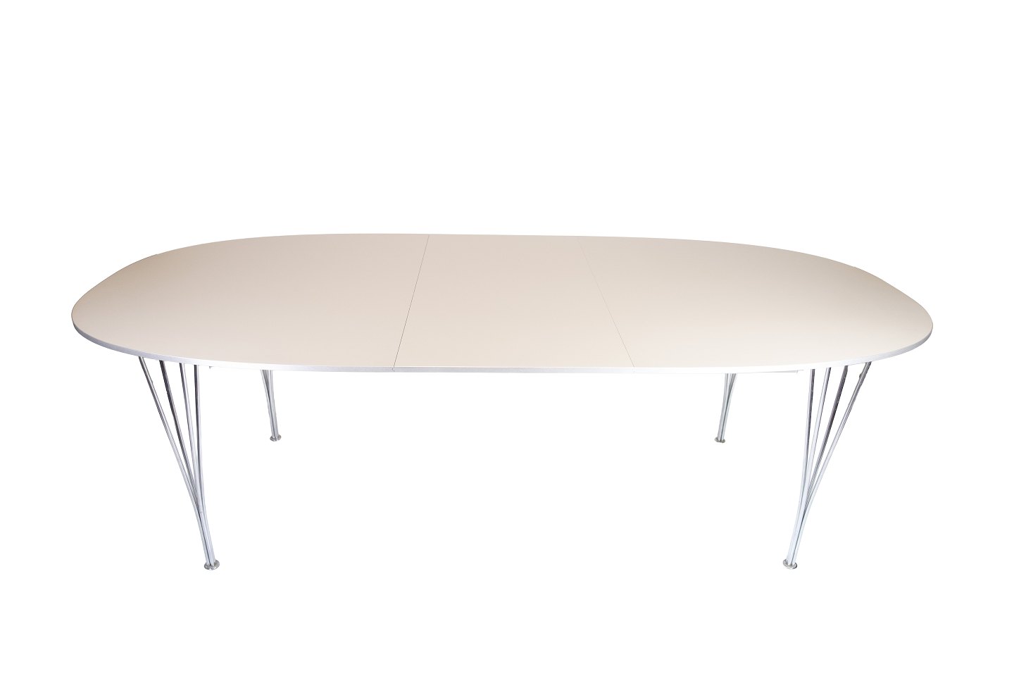 Superellipse spisebord, model B616, designet af Piet Hein i samarbejde med Bruno Mathsson og Arne Jacobsen for Fritz Hansen. Bordet har et minimalistisk udtryk med grå laminatplade og forkromede stålben i det ikoniske spændben-design. Den superelliptiske form gør bordet ideelt til både hverdag og gæstemiddage, og to medfølgende tillægsplader giver mulighed for fleksibel udvidelse.