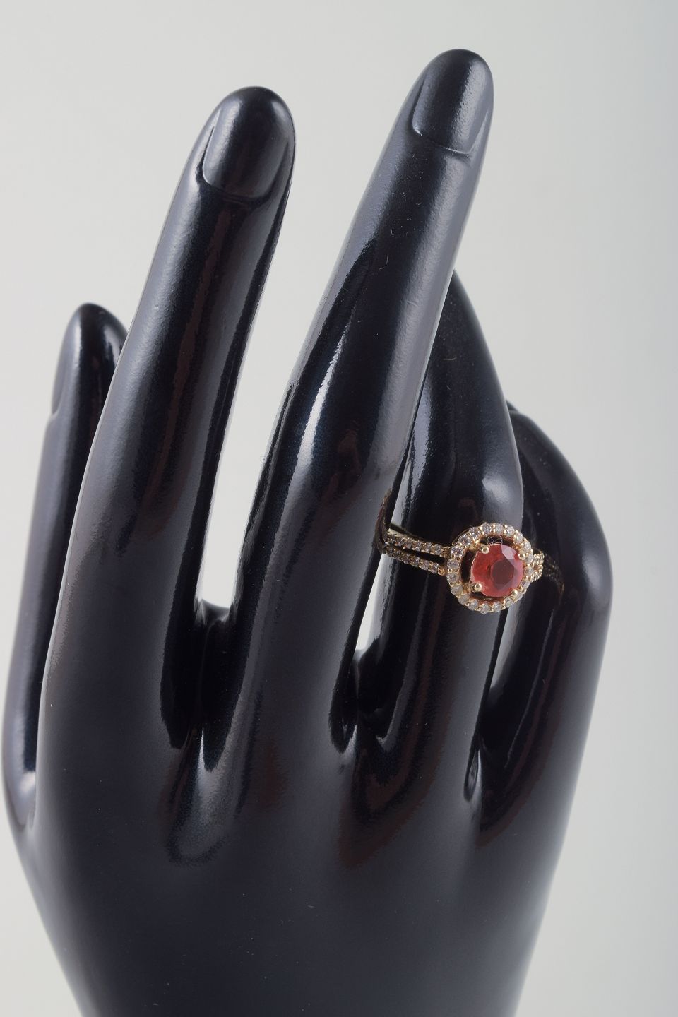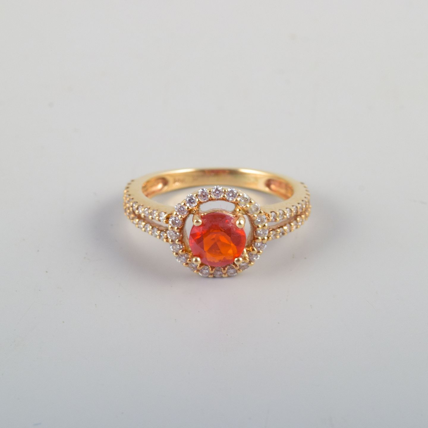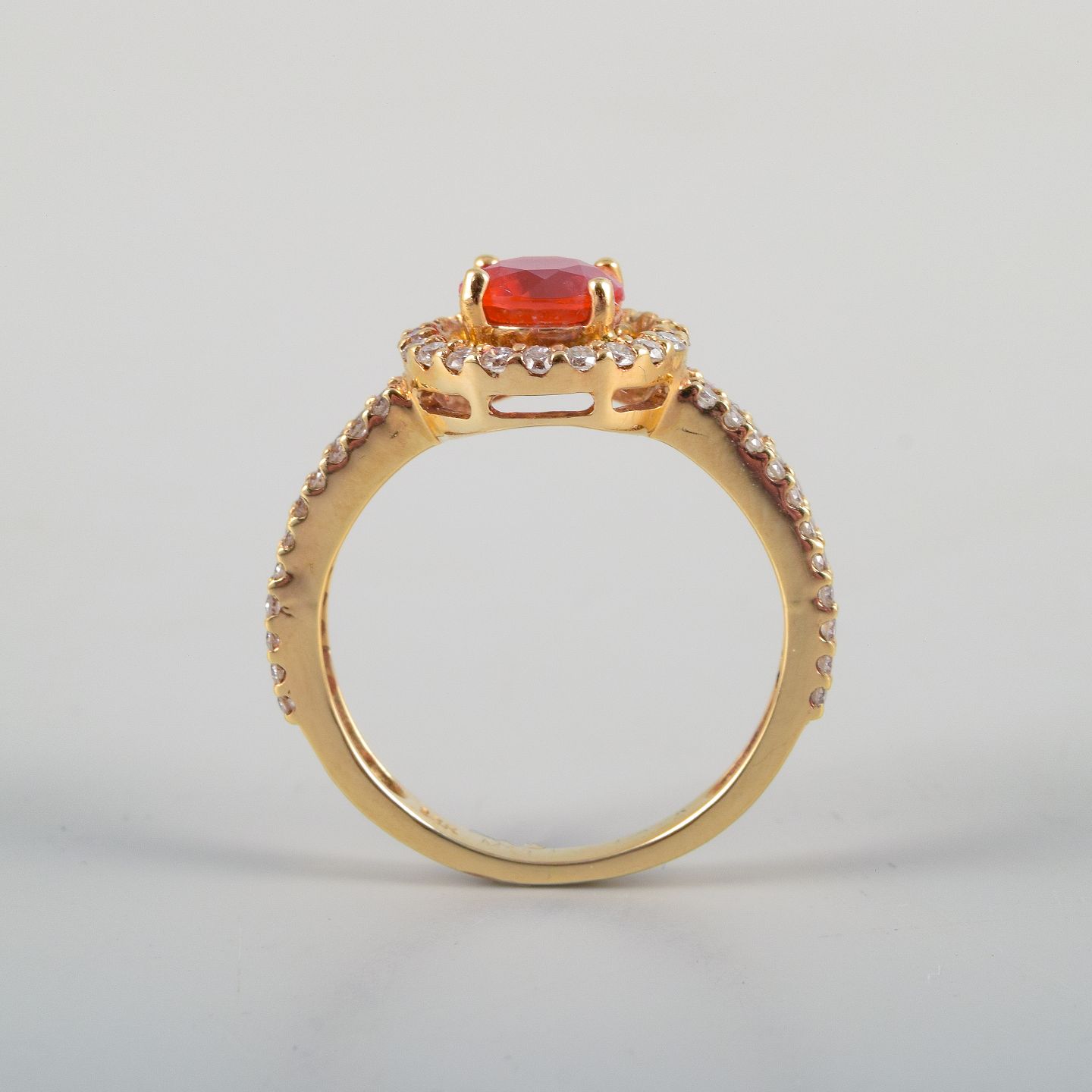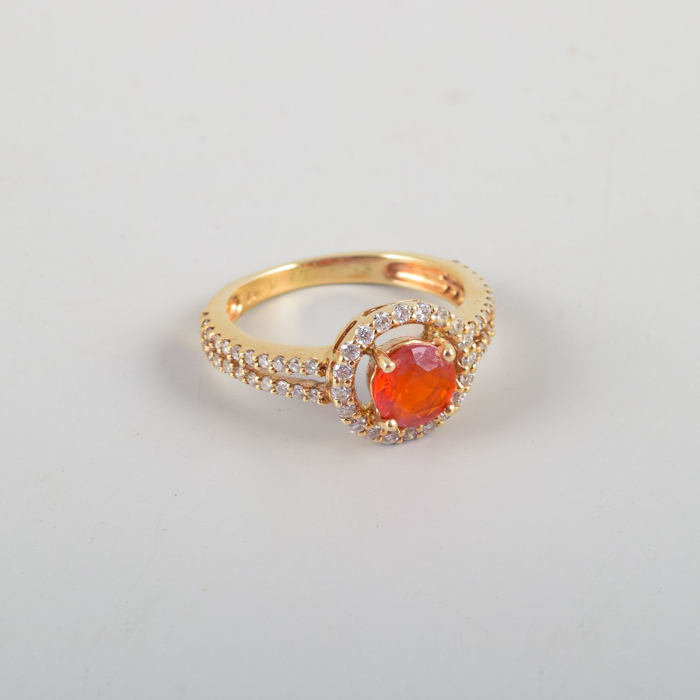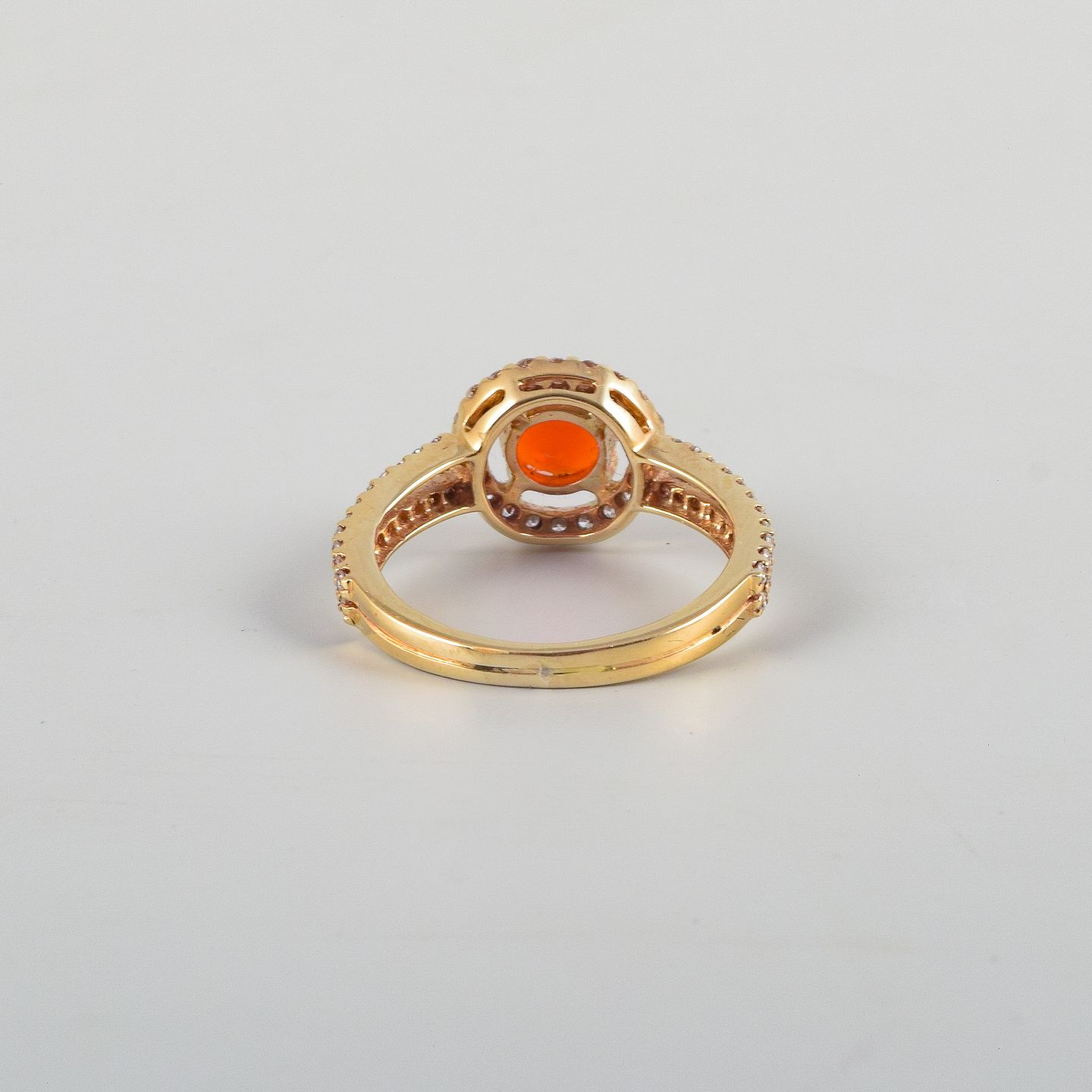 14 karat guldring prydet med orange opal og talrige brillianter.