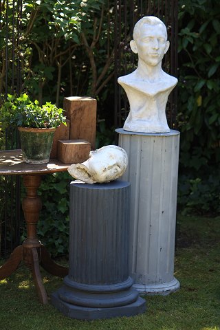 Gammel fransk søjle piedestal i træ med grå farve og en super fin patina.