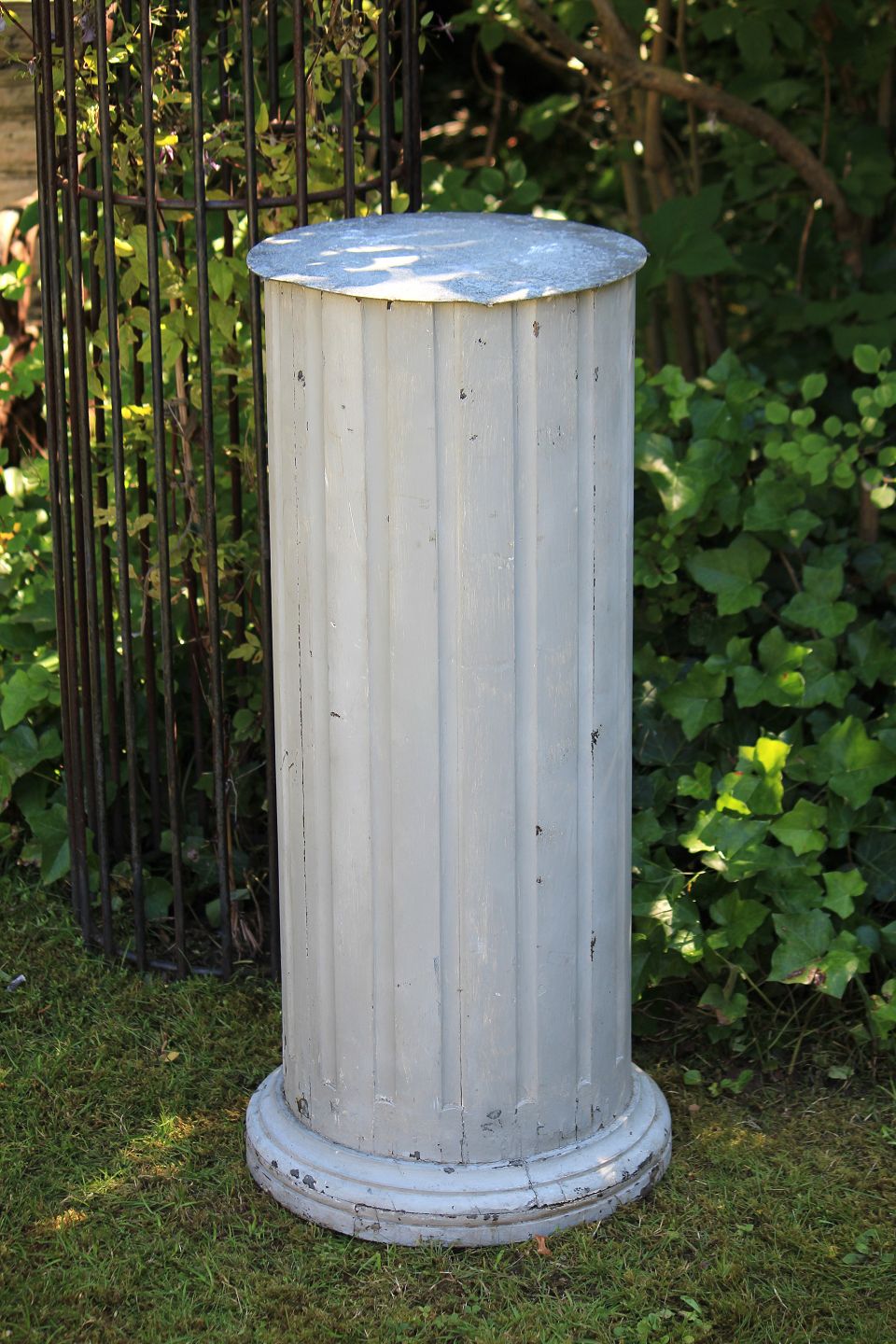 Gammel fransk søjle piedestal i træ med grå farve og med metalplade på toppen , samt med en super fin patina.