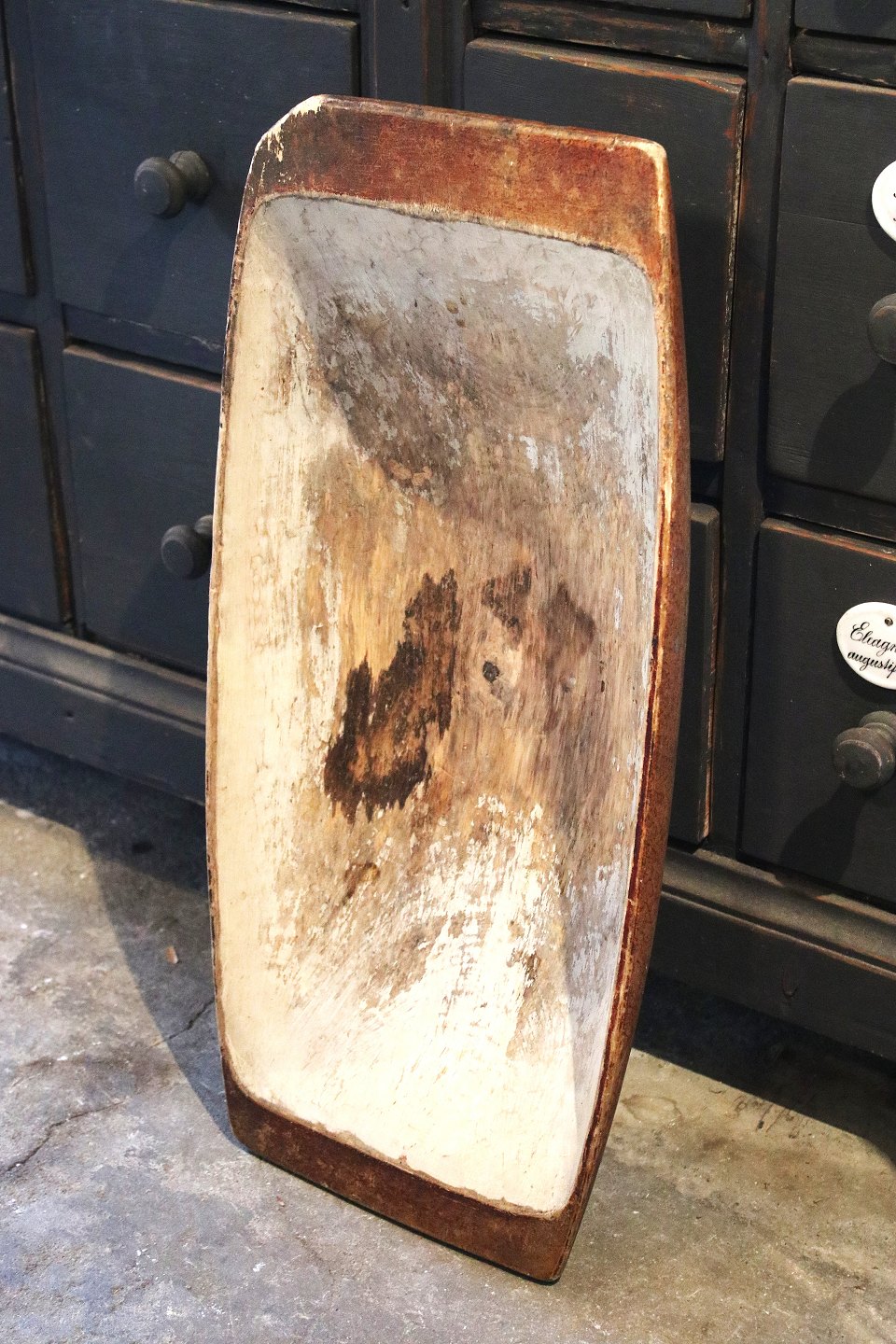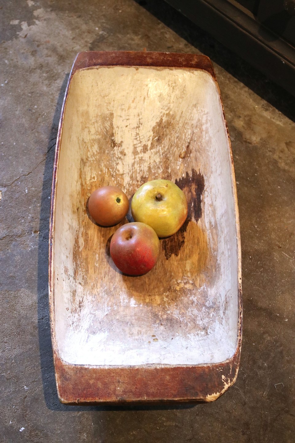 Svensk rustikt 1800 tals træfad med original farve og med en rigtig flot patina. H: 12cm. L: 63cm. B: 28,5cm.