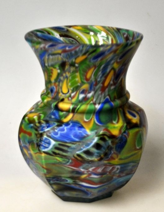 Millefiori vase Johansfors glasbruk, Sverige. Indvendig multifarvet glas; udvendig matteret glas. ca. 1920. H.: 12,5 cm.