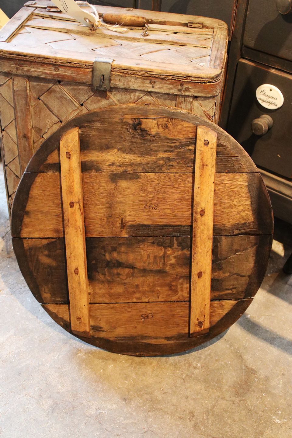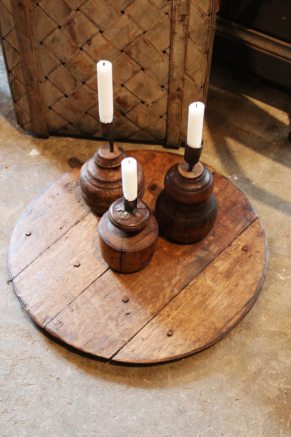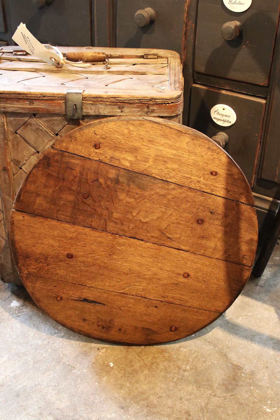 Svensk 1800 tals rund træplade i træ med en rigtig fin patina.