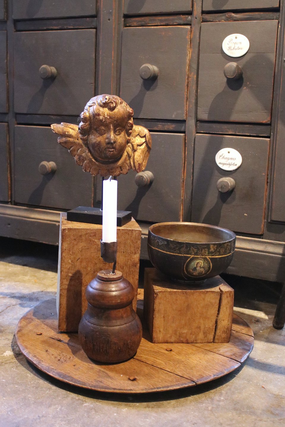 Vi tilbyder et bredt udvalg af gamle møbler med karakter , prismelysekroner og franske kirkestager.