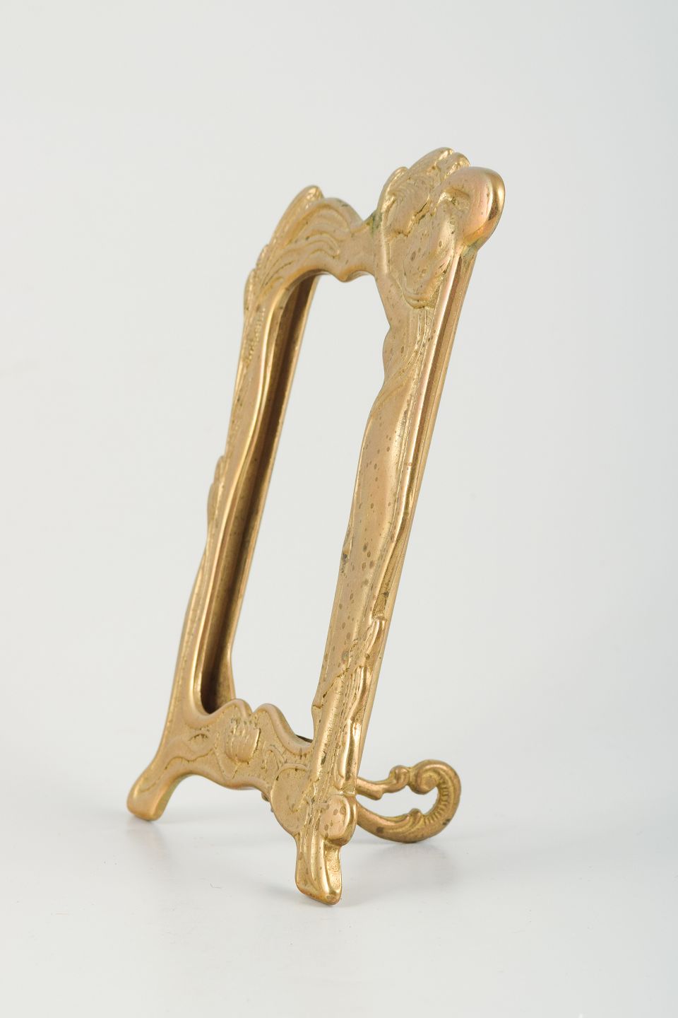 Smuk og dekorativ billedramme i forgyldt messing fra Art Nouveau-perioden (ca. 1890-1910). Designet prydes af en yndefuld kvindefigur i relief omgivet af bløde, organiske linjer og blomsterornamentik – et klassisk Jugendstil-motiv. Rammen har en varm gylden patina og fremstår uden glas og bagstykke.