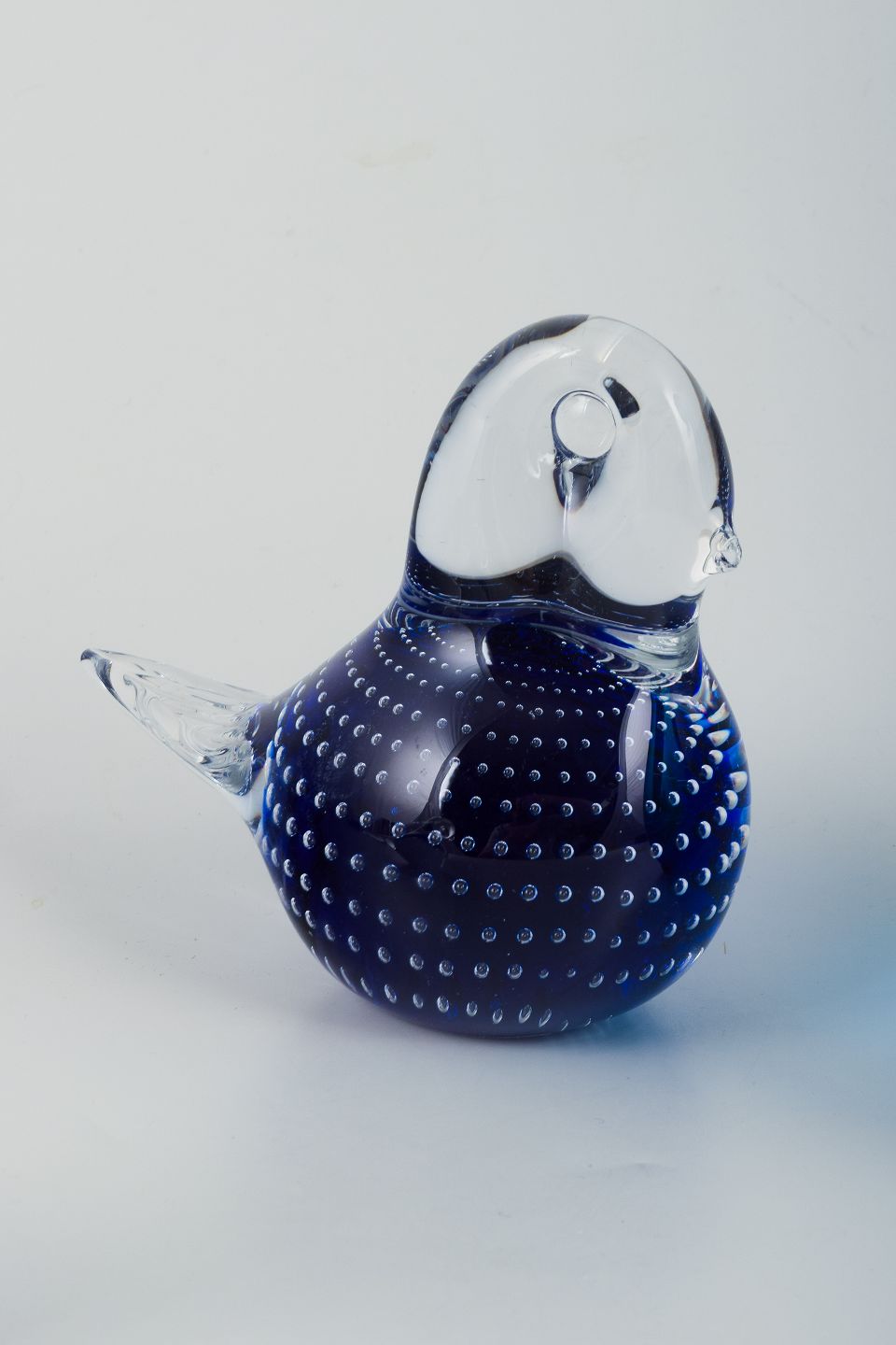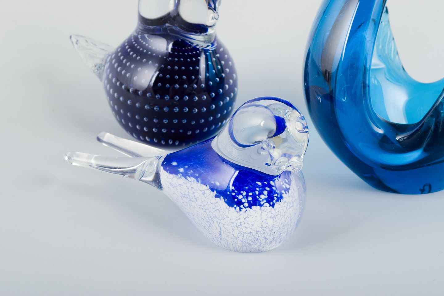 Tre figurer af fugle i kunstglas.