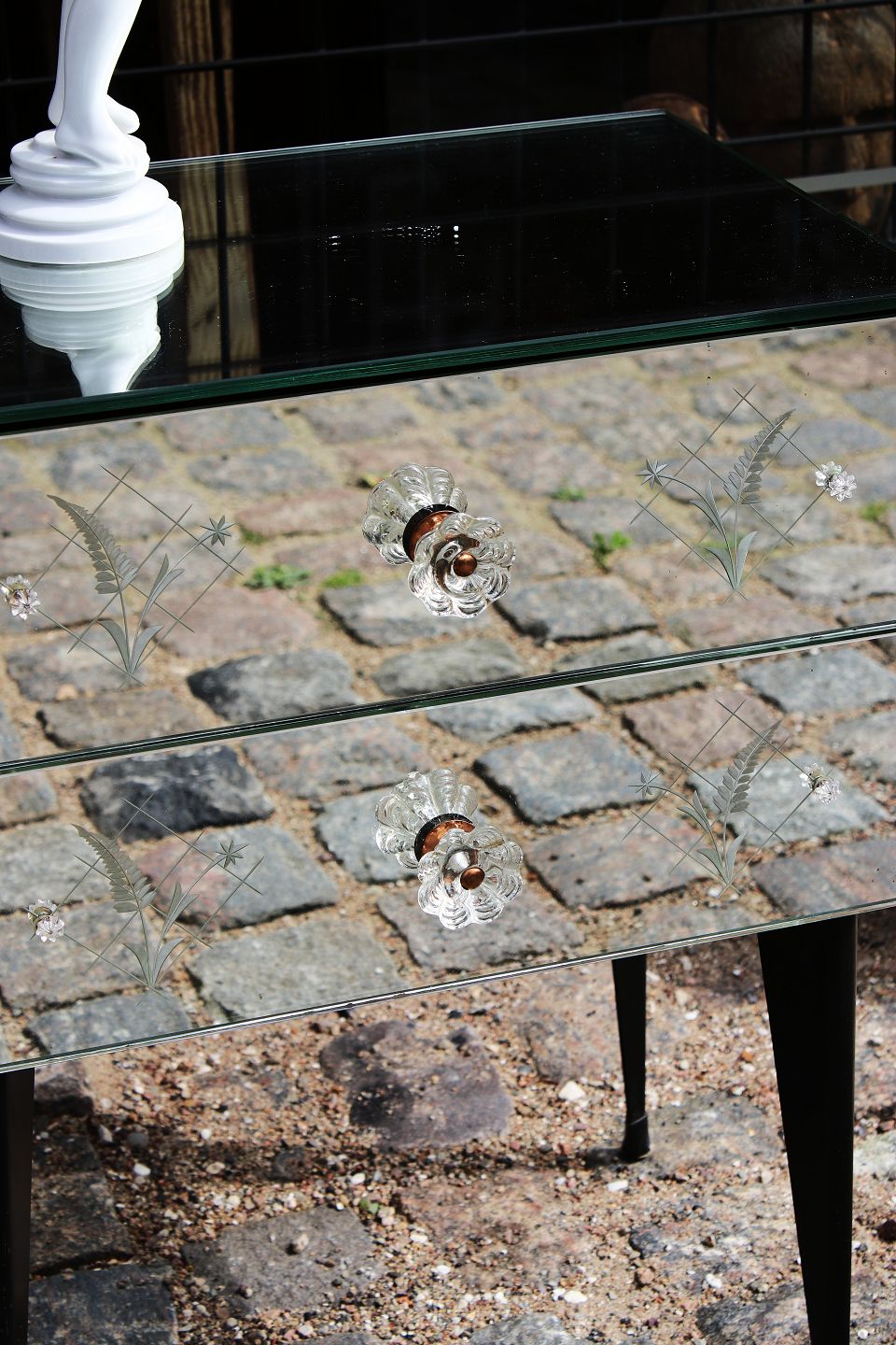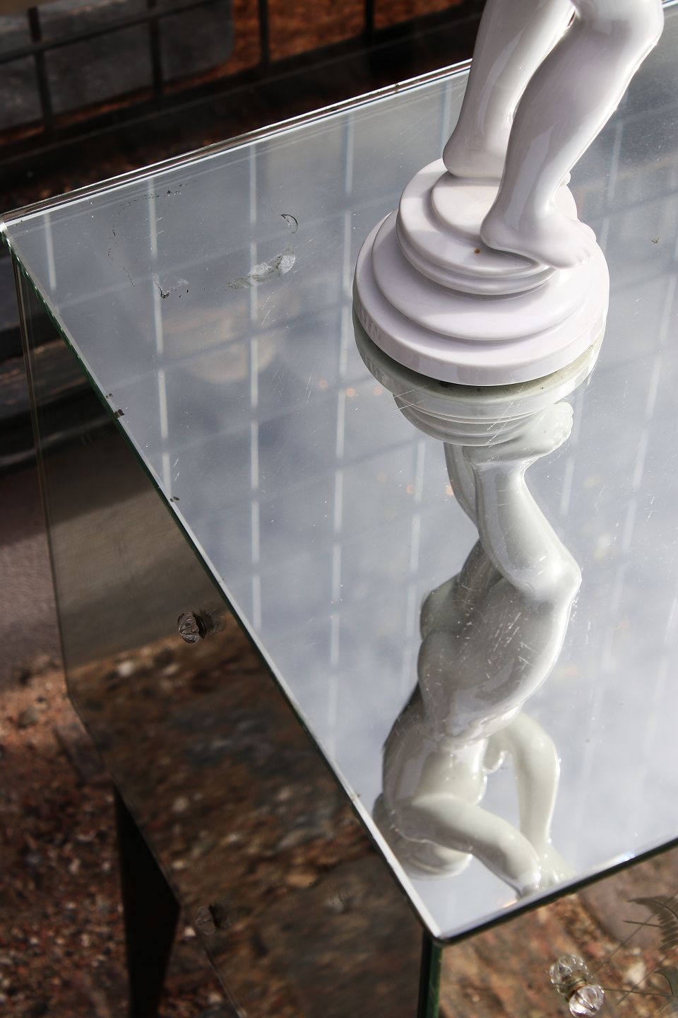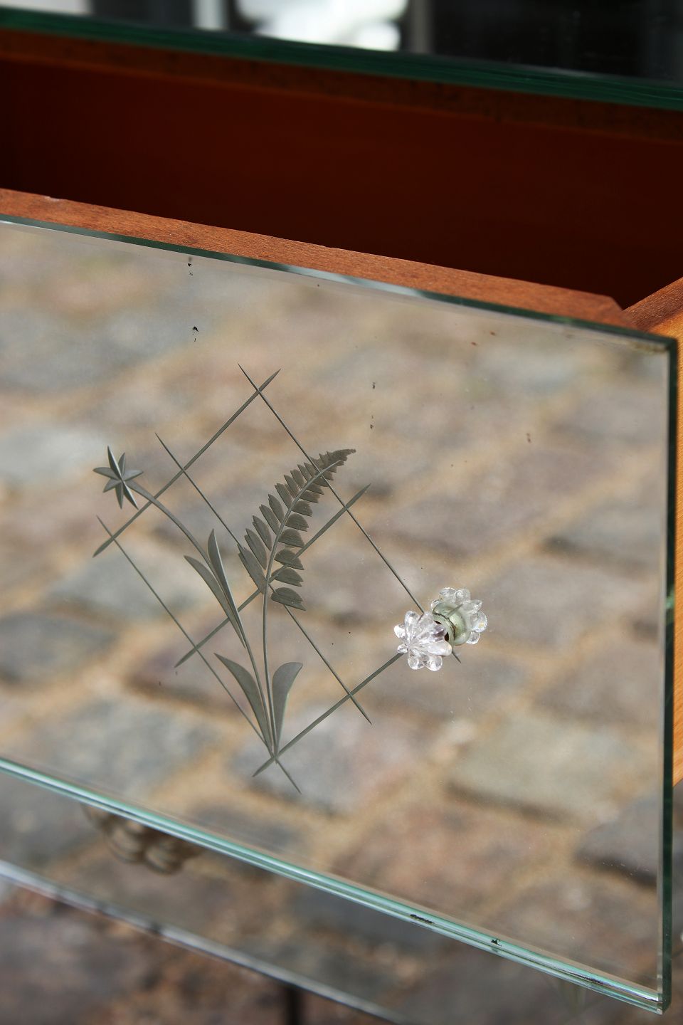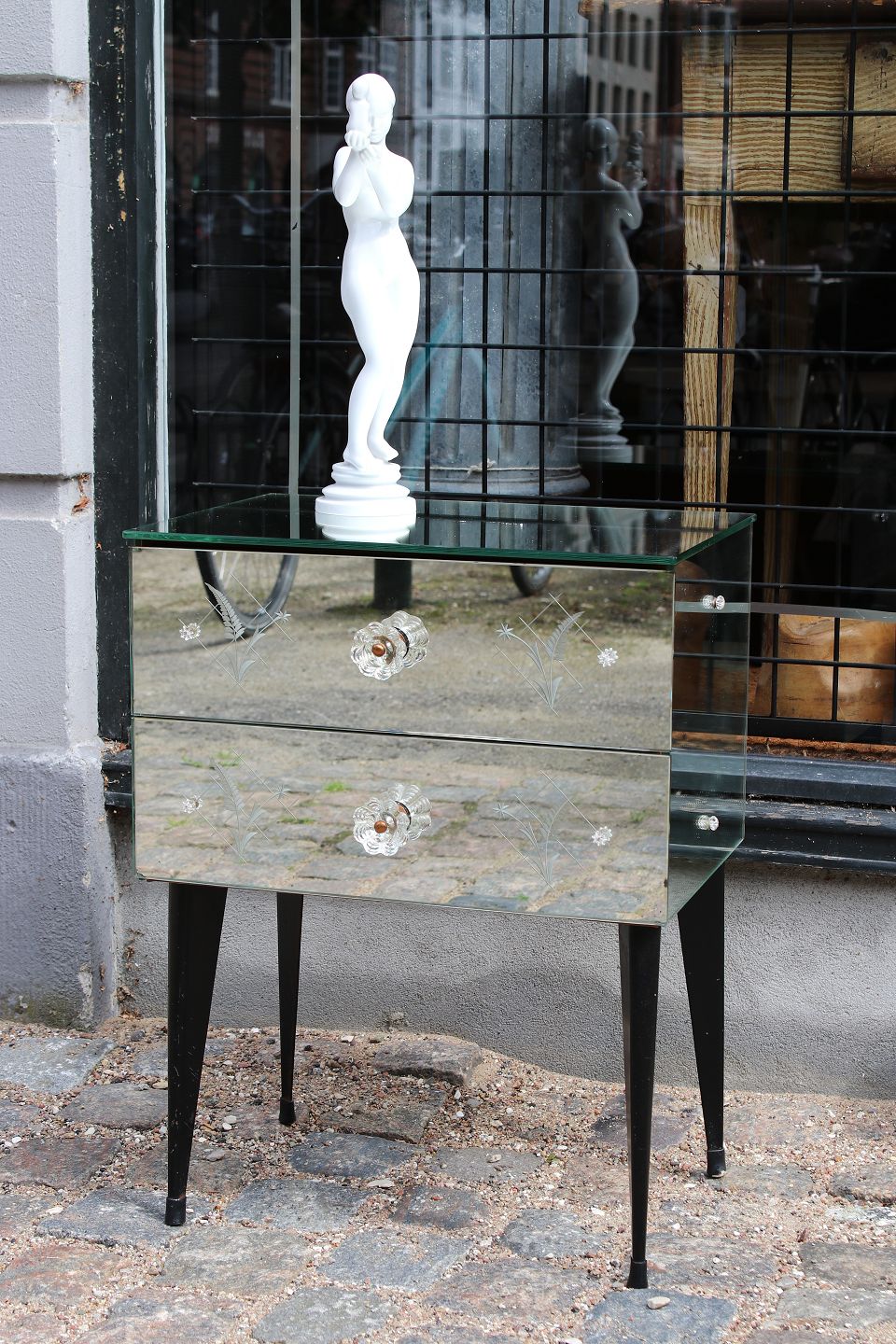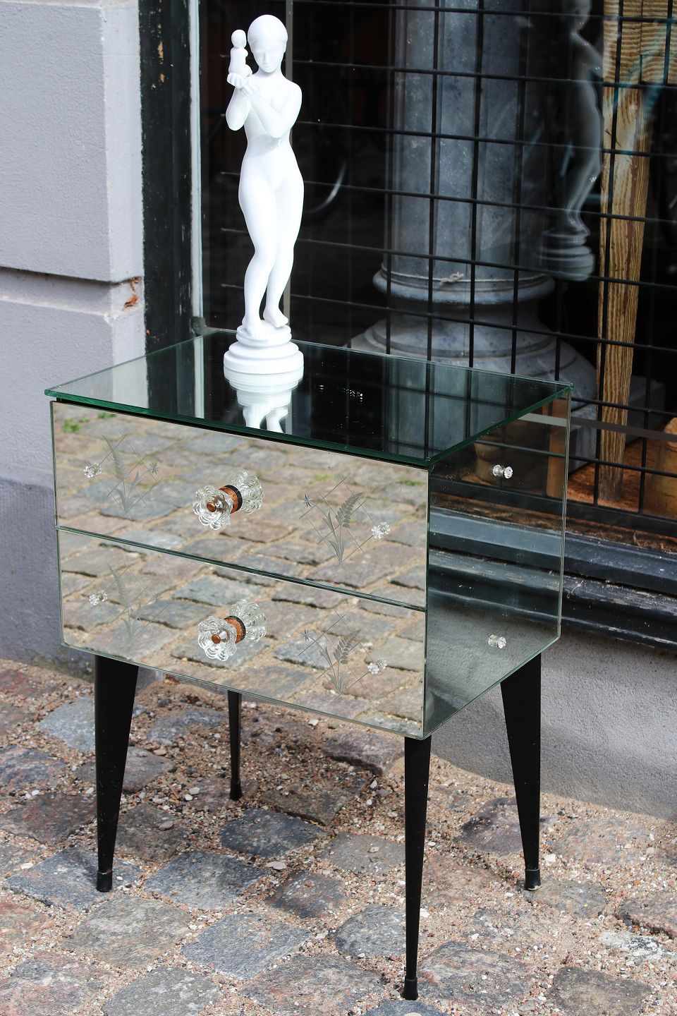 Fin gammel fransk spejlkommode fra omkring 40érne med spejlglas på alle flader , 2 skuffer med glasgreb og ornamentering i spejlglasset.