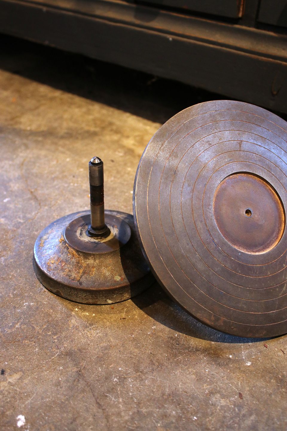 Gammel drejeskive på fod i jern med en rigtig fin patina.