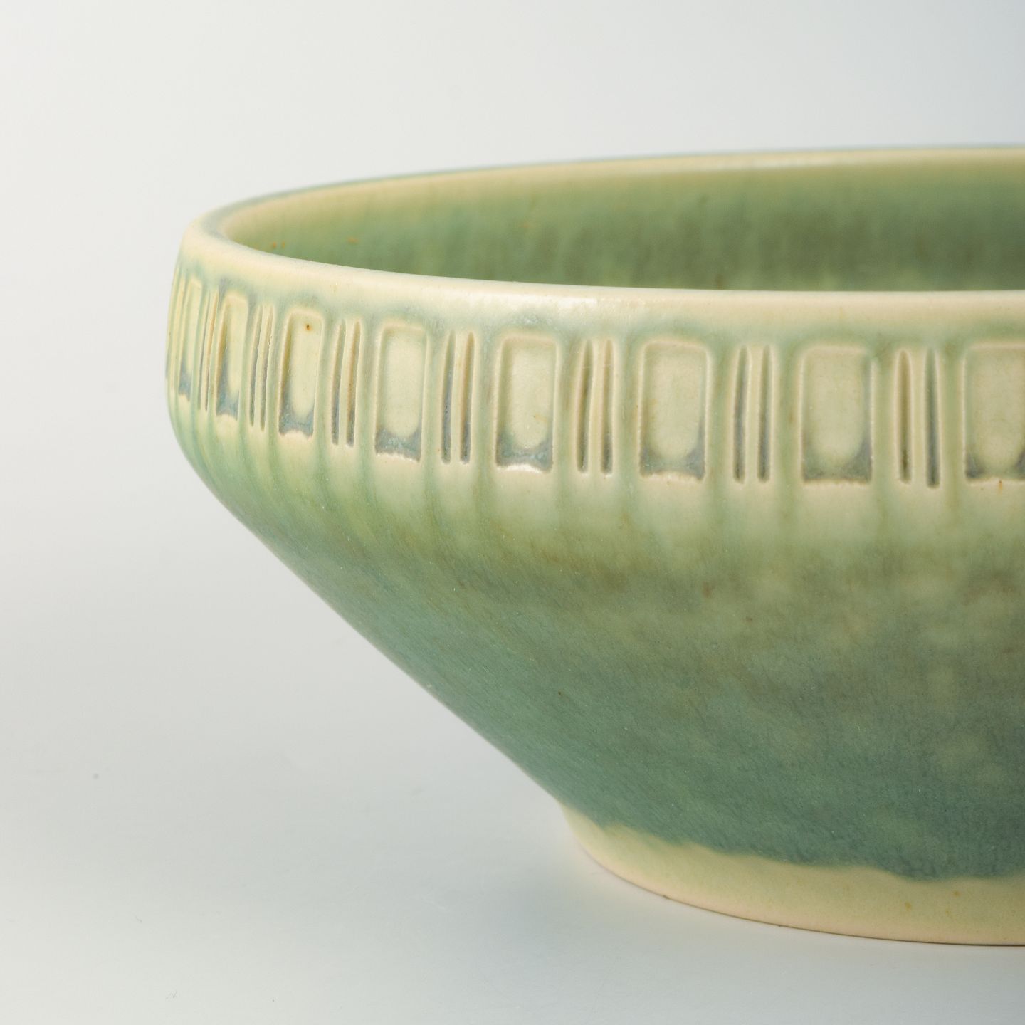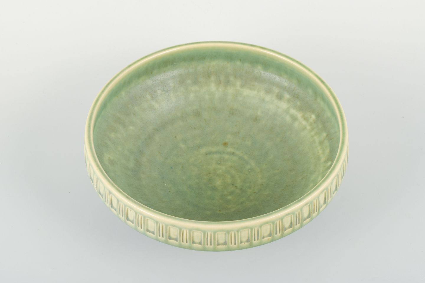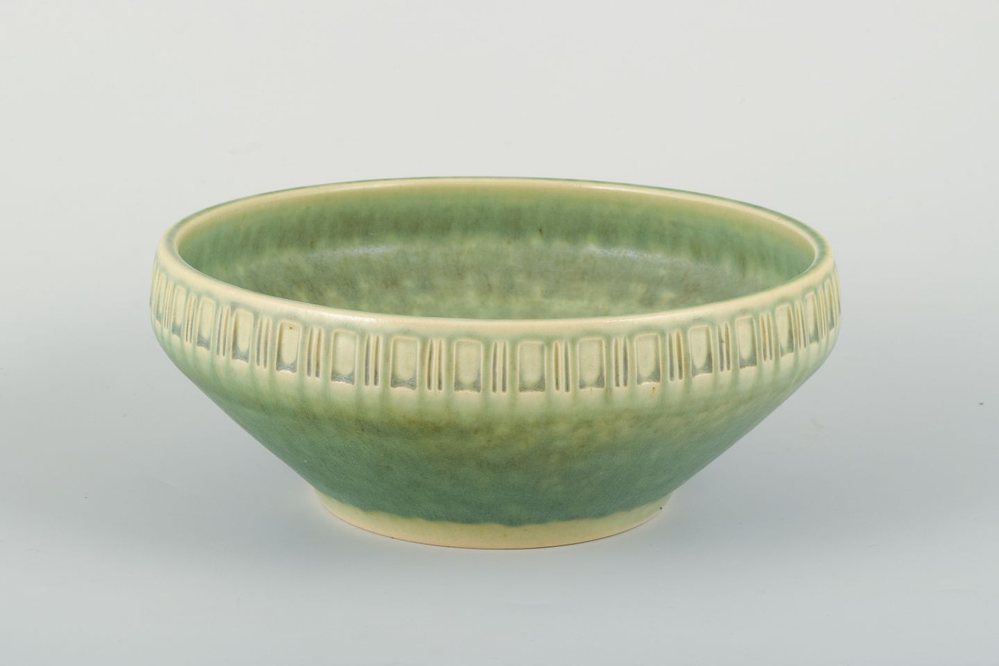 Michael Andersen stentøjsskål i grøn glasur med reliefdekoreret bort langs kanten.