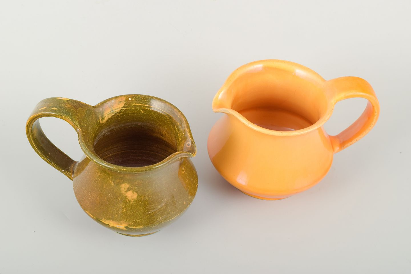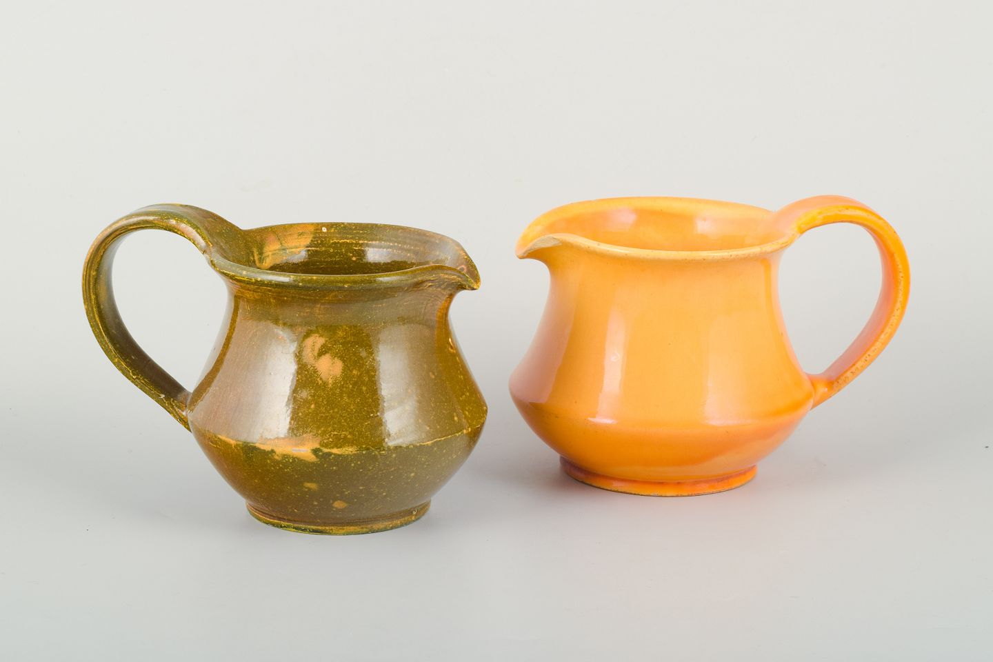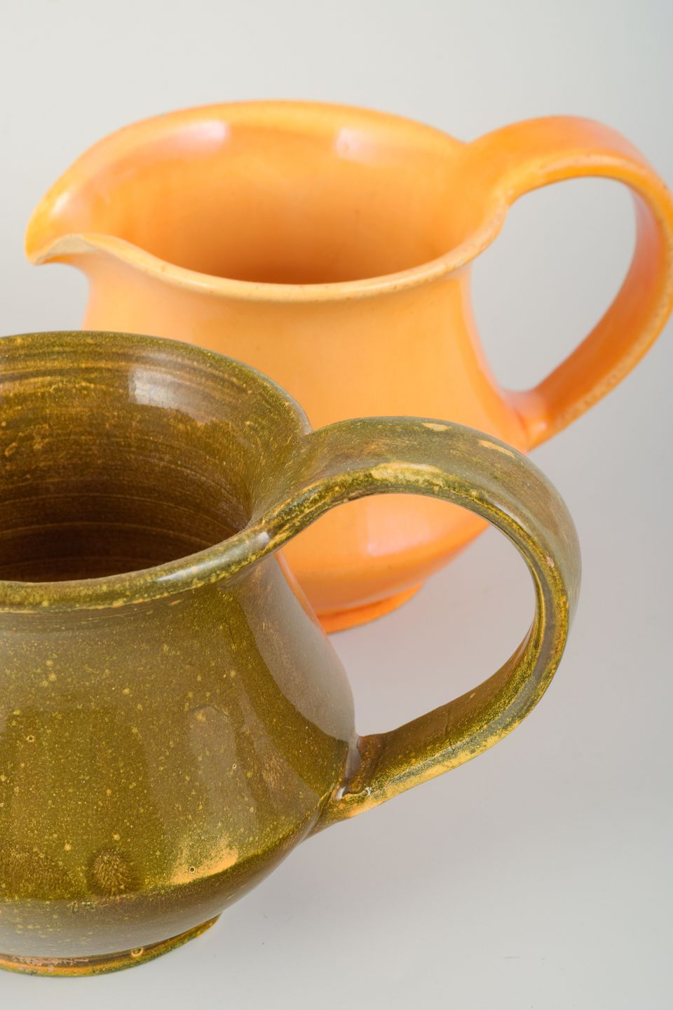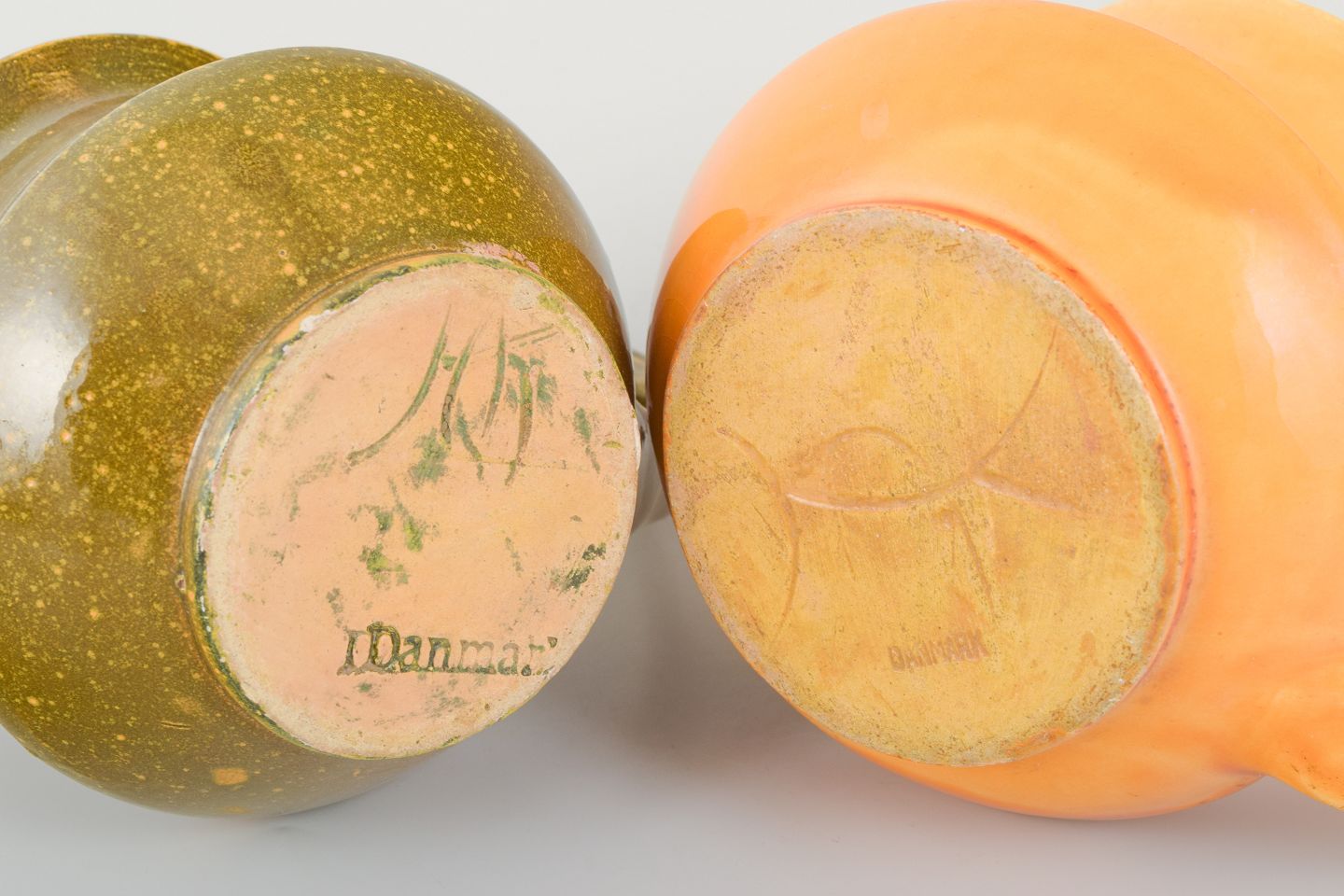 To keramikkander fra Kähler, glaseret i henholdsvis grøn og orange uranglasur. Klassisk form med rund krop, markant tud og hank.