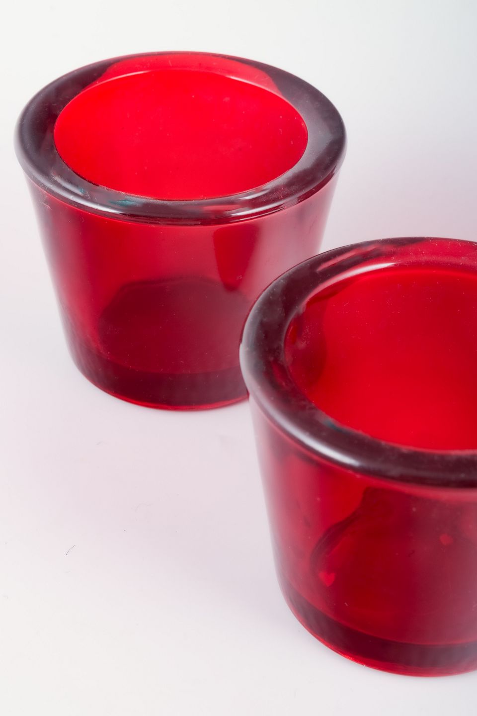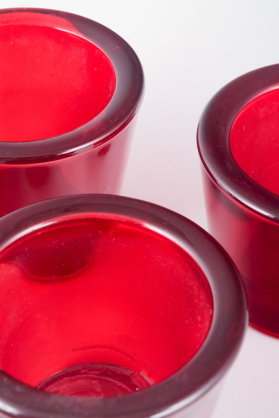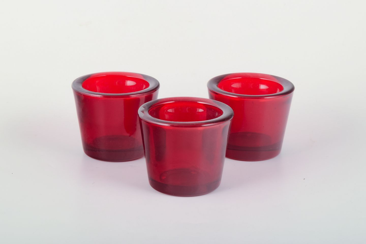 Tre stager til fyrfadslys i rødt glas.